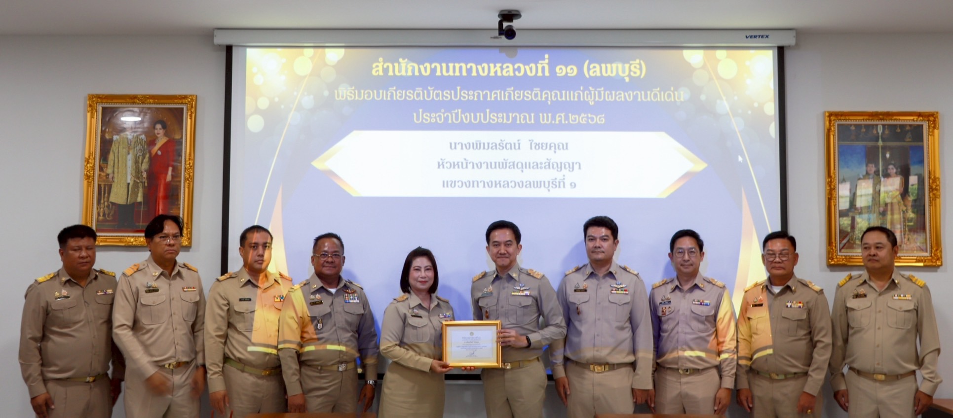 ในการปฏิบัติงาน จาก นายกฤษณ์ หย่ำวิไล ผู้อำนวยการแขวงทางหลวงลพบุรีที่ 1 และมอบเกียรติบัตรประกาศเกียรติคุณแก่ผู้มีผลงานดีเด่นประจำปีงบประมาณ โดยมีรองผู้อำนวยการสำนักงานทางหลวงที่ 11 ตำแหน่งที่ 1 และตำแหน่งที่ 2 ผู้อำนวยการแขวงทางหลวงในสังกัด พร้อมด้วย ผู้อำนวยการส่วนฯ และเจ้าหน้าที่แขวงฯ ลพบุรีที่ 1 เข้าร่วมประชุมโดยพร้อมเพรียงกัน ณ ห้องประชุม อาคาร 113 ปี กรมทางหลวง แขวงทางหลวงลพบุรีที่ 1