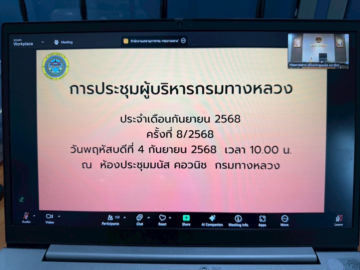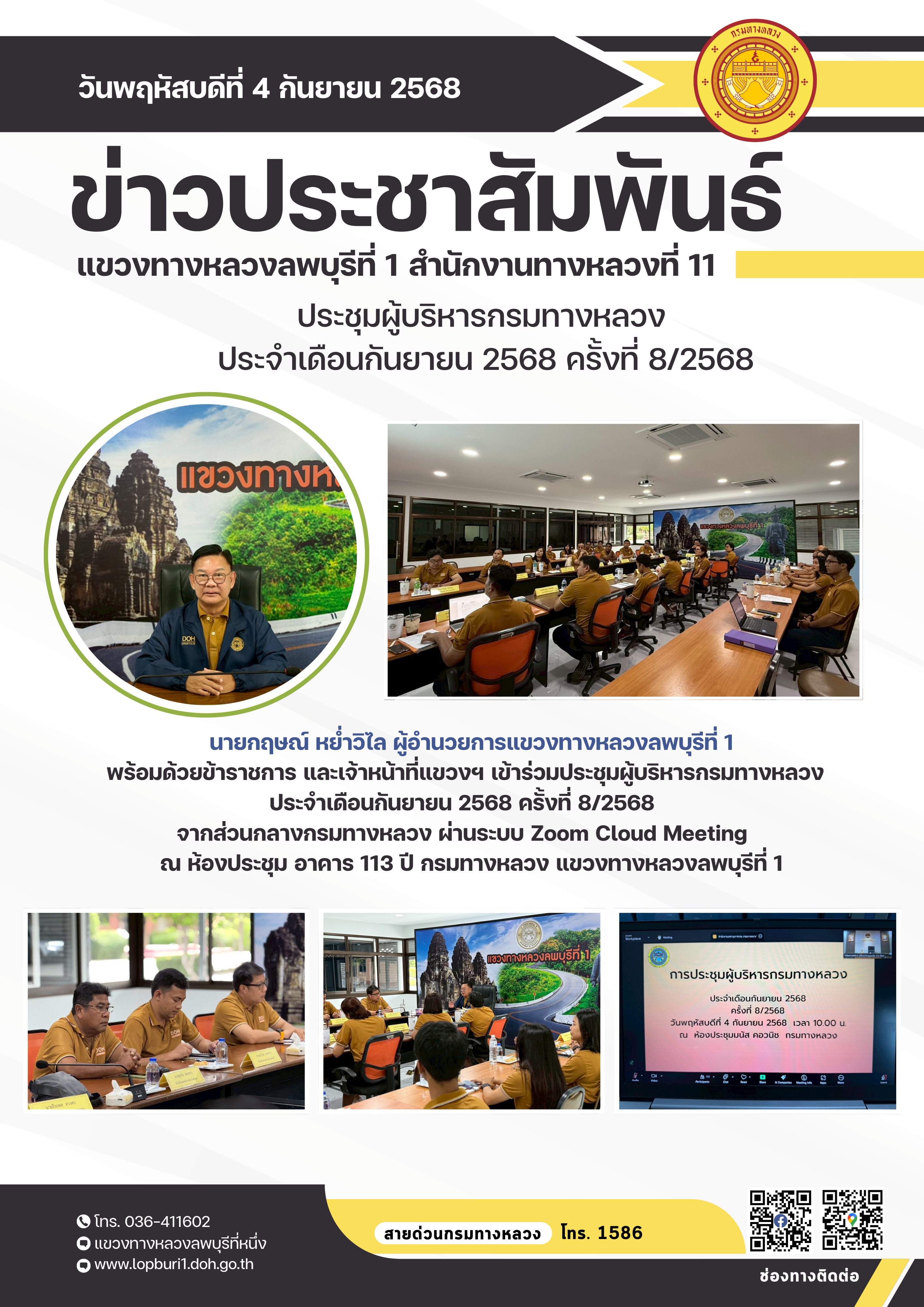 นายกฤษณ์ หย่ำวิไล ผู้อำนวยการแขวงทางหลวงลพบุรีที่ 1 พร้อมด้วยข้าราชการ และเจ้าหน้าที่แขวงฯ เข้าร่วมประชุมผู้บริหารกรมทางหลวง ประจำเดือนกันยายน 2568 ครั้งที่ 8/2568 จากส่วนกลางกรมทางหลวง ผ่านระบบ Zoom Cloud Meeting ณ ห้องประชุม อาคาร 113 ปี กรมทางหลวง แขวงทางหลวงลพบุรีที่ 1