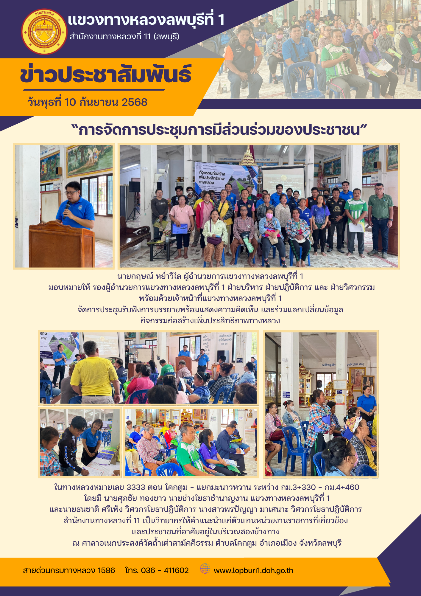 นายกฤษณ์ หย่ำวิไล ผู้อำนวยการแขวงทางหลวงลพบุรีที่ 1 มอบหมายให้ รองผู้อำนวยการแขวงทางหลวงลพบุรีที่ 1 ฝ่ายบริหาร ฝ่ายปฏิบัติการ และ ฝ่ายวิศวกรรม พร้อมด้วยเจ้าหน้าที่แขวงทางหลวงลพบุรีที่ 1 จัดการประชุมรับฟังการบรรยายพร้อมแสดงความคิดเห็น และร่วมแลกเปลี่ยนข้อมูล กิจกรรมก่อสร้างเพิ่มประสิทธิภาพทางหลวง ในทางหลวงหมายเลข 3333 ตอน โคกตูม - แยกมะนาวหวาน ระหว่าง กม.3+330 – กม.4+460 โดยมี นายศุภชัย ทองขาว นายช่างโยธาชำนาญงาน แขวงทางหลวงลพบุรีที่ 1 และนายธนชาติ ศรีเพ็ง วิศวกรโยธาปฏิบัติการ นางสาวพรปัญญา มาเสนาะ วิศวกรโยธาปฏิบัติการ สำนักงานทางหลวงที่ 11 เป็นวิทยากรให้คำแนะนำแก่ตัวแทนหน่วยงานราชการที่เกี่ยวข้อง