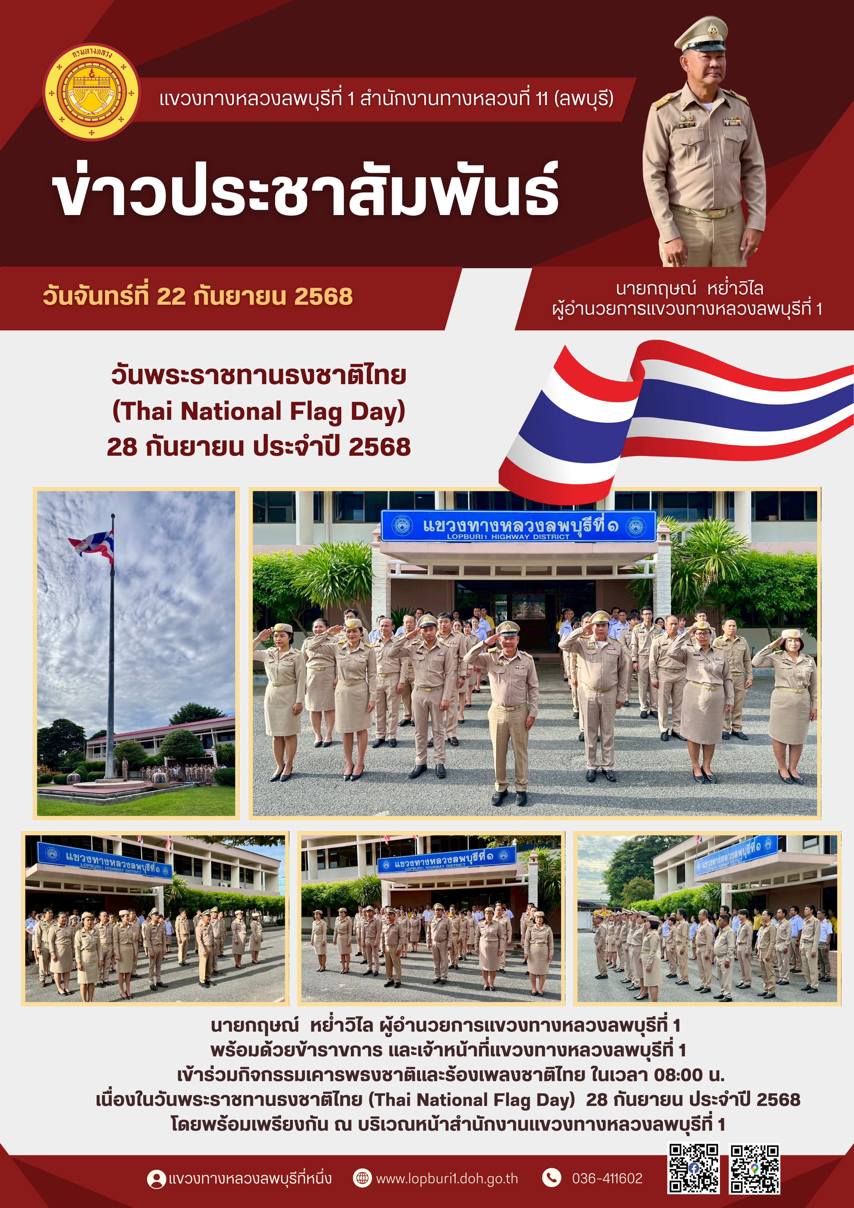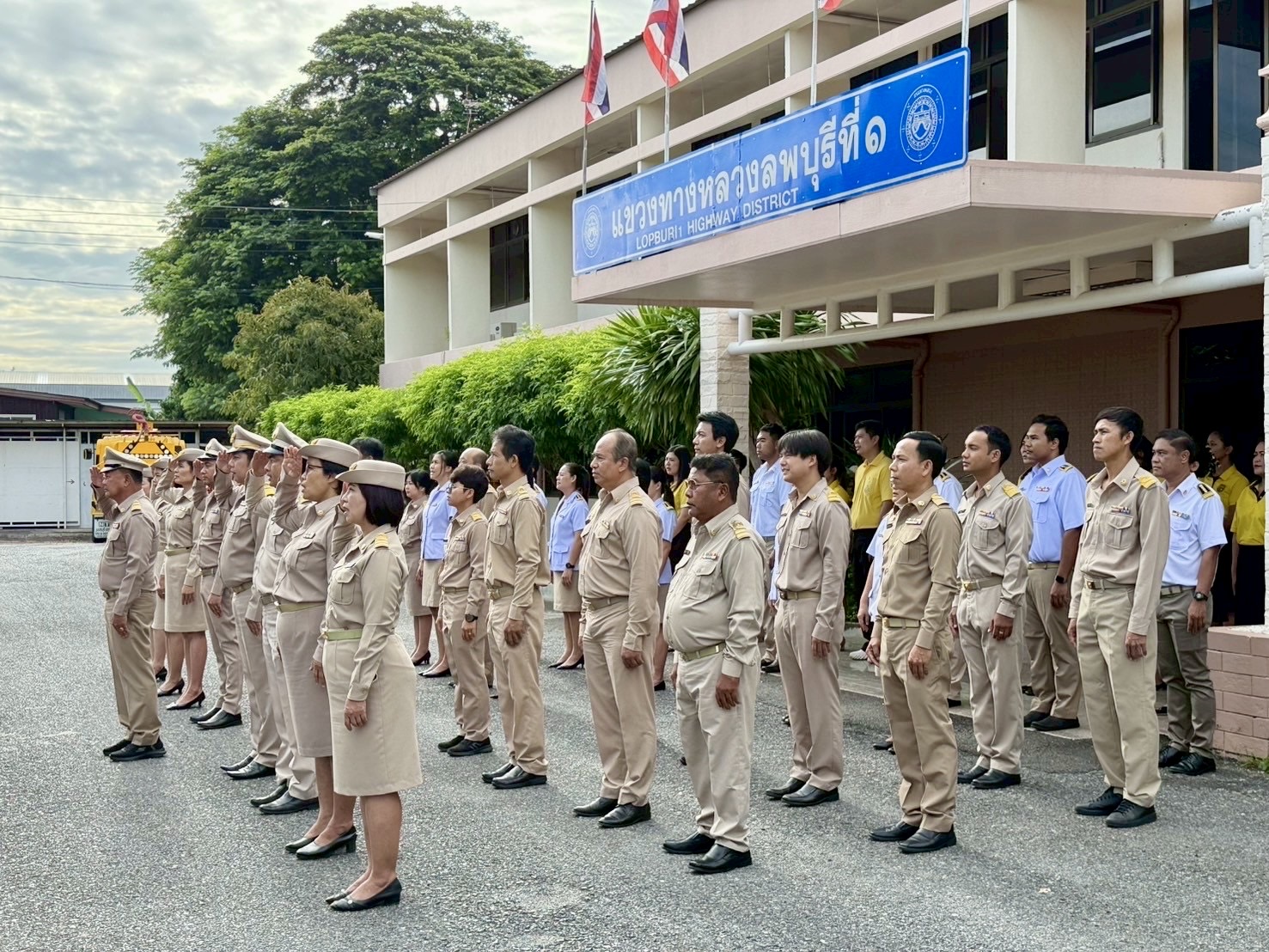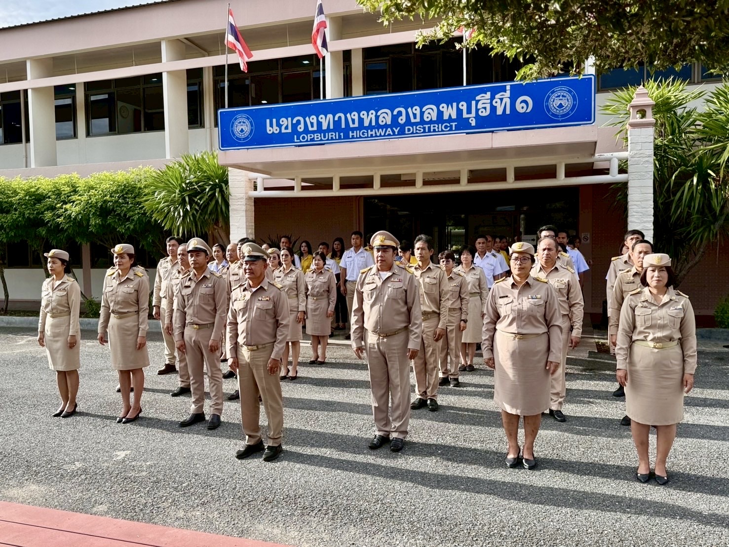 วันจันทร์ที่ 22 กันยายน 2568 เวลา 08.00 น. นายกฤษณ์ หย่ำวิไล ผู้อำนวยการแขวงทางหลวงลพบุรีที่ 1 พร้อมด้วยข้าราขการ และเจ้าหน้าที่แขวงทางหลวงลพบุรีที่ 1 เข้าร่วมกิจกรรมเคารพธงชาติและร้องเพลงชาติไทย ในเวลา 08:00 น. เนื่องในวันพระราชทานธงชาติไทย (Thai National Flag Day) 28 กันยายน ประจำปี 2568 โดยพร้อมเพรียงกัน ณ บริเวณหน้าสำนักงานแขวงทางหลวงลพบุรีที่ 1