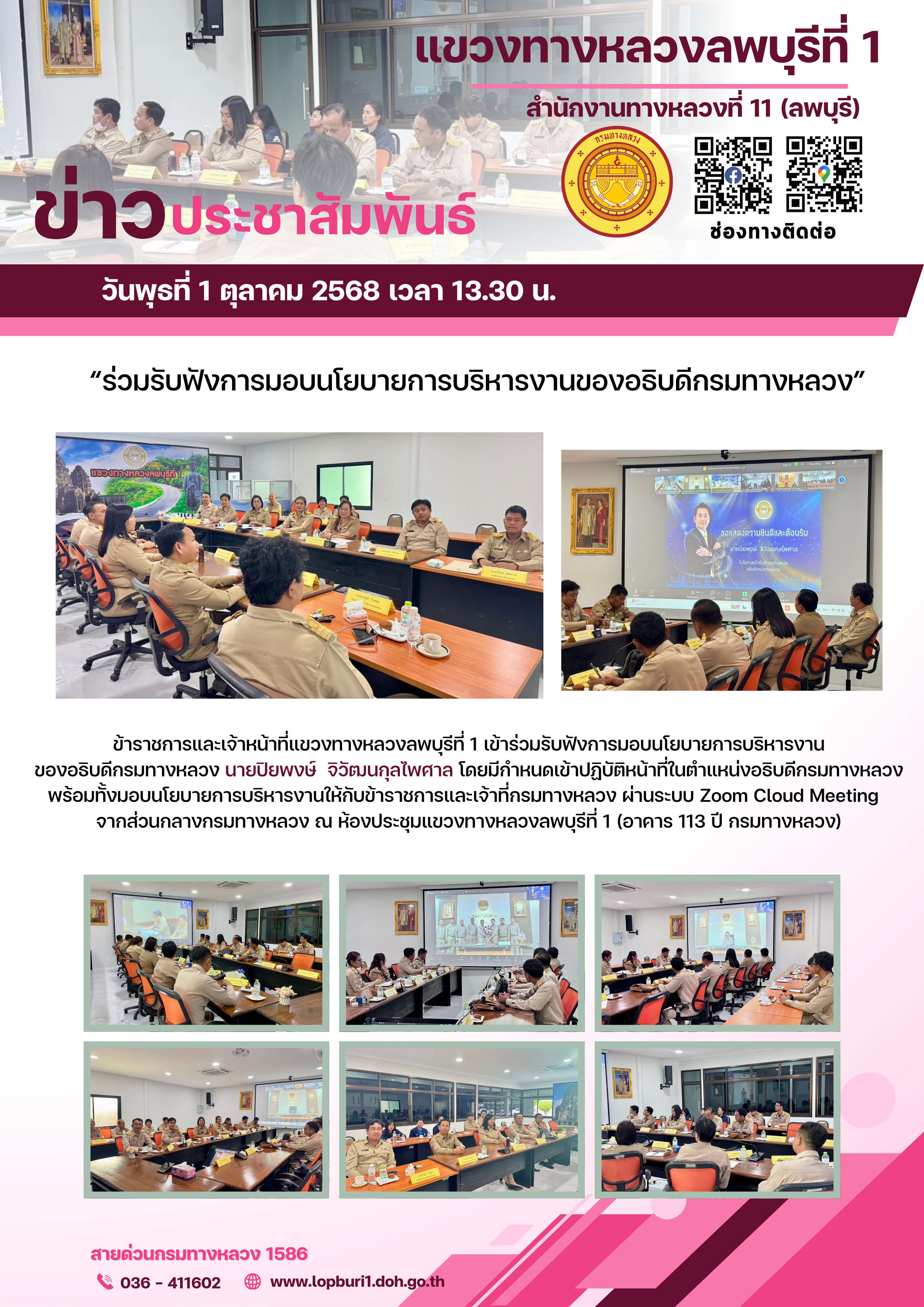 ข้าราชการและเจ้าหน้าที่แขวงทางหลวงลพบุรีที่ 1 เข้าร่วมรับฟังการมอบนโยบายการบริหารงานของอธิบดีกรมทางหลวง นายปิยพงษ์ จิวัฒนกุลไพศาล โดยมีกำหนดเข้าปฏิบัติหน้าที่ในตำแหน่งอธิบดีกรมทางหลวง พร้อมทั้งมอบนโยบายการบริหารงานให้กับข้าราชการและเจ้าที่กรมทางหลวง ผ่านระบบ Zoom Cloud Meeting จากส่วนกลางกรมทางหลวง ณ ห้องประชุมแขวงทางหลวงลพบุรีที่ 1 (อาคาร 113 ปี กรมทางหลวง)