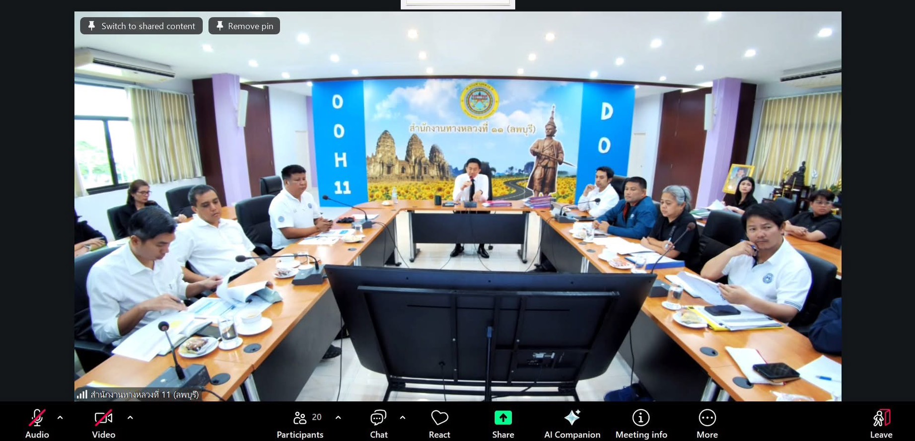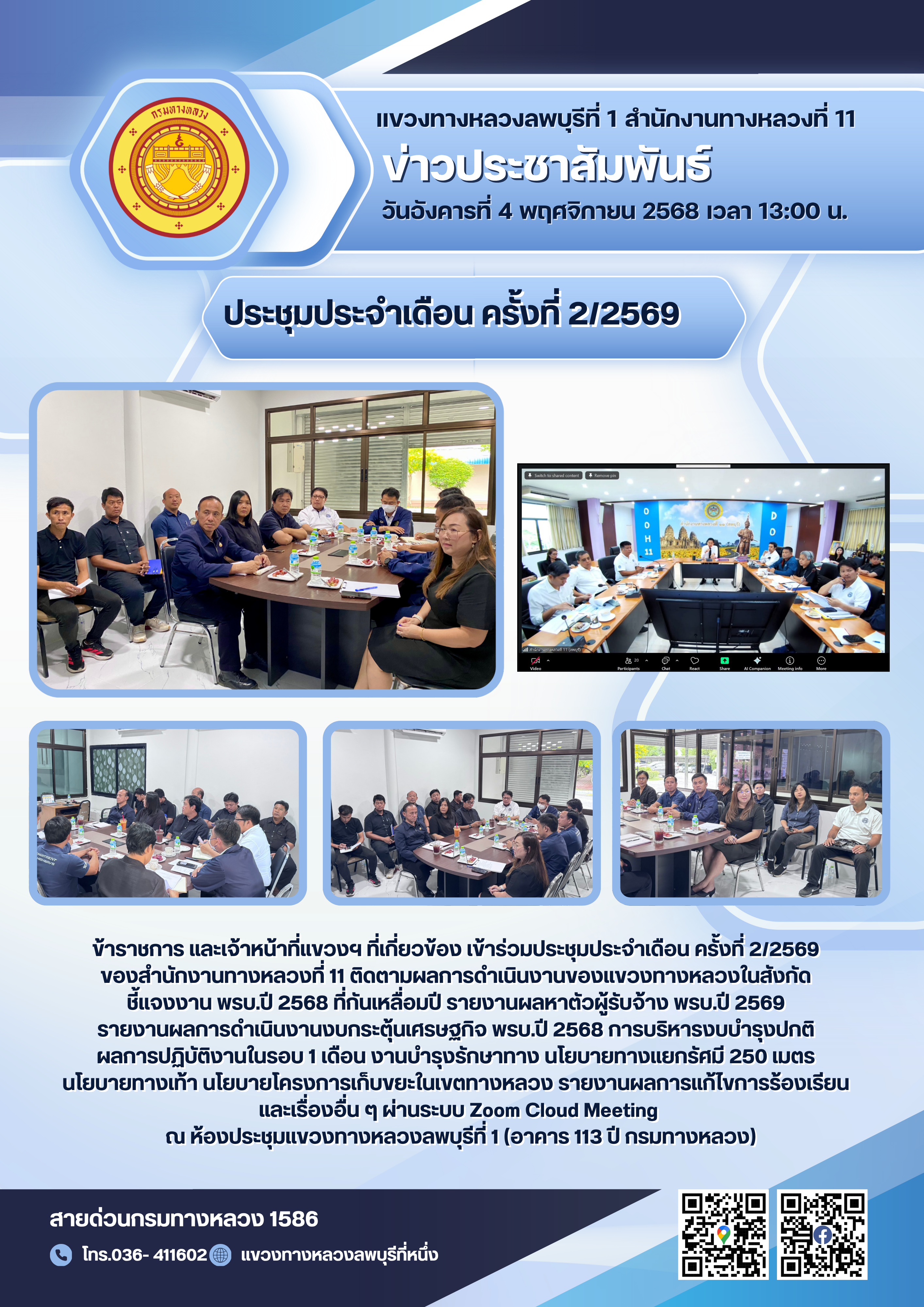 ข้าราชการ และเจ้าหน้าที่แขวงฯ ที่เกี่ยวข้อง เข้าร่วมประชุมประจำเดือน ครั้งที่ 2/2569 ของสำนักงานทางหลวงที่ 11 ติดตามผลการดำเนินงานของแขวงทางหลวงในสังกัด ชี้แจงงาน พรบ.ปี 2568 ที่กันเหลื่อมปี รายงานผลหาตัวผู้รับจ้าง พรบ.ปี 2569 รายงานผลการดำเนินงานงบกระตุ้นเศรษฐกิจ พรบ.ปี 2568 การบริหารงบบำรุงปกติ ผลการปฏิบัติงานในรอบ 1 เดือน งานบำรุงรักษาทาง นโยบายทางแยกรัศมี 250 เมตร นโยบายทางเท้า นโยบายโครงการเก็บขยะในเขตทางหลวง รายงานผลการแก้ไขการร้องเรียน และเรื่องอื่น ๆ ผ่านระบบ Zoom Cloud Meeting ณ ห้องประชุมแขวงทางหลวงลพบุรีที่ 1 (อาคาร 113 ปี กรมทางหลวง)