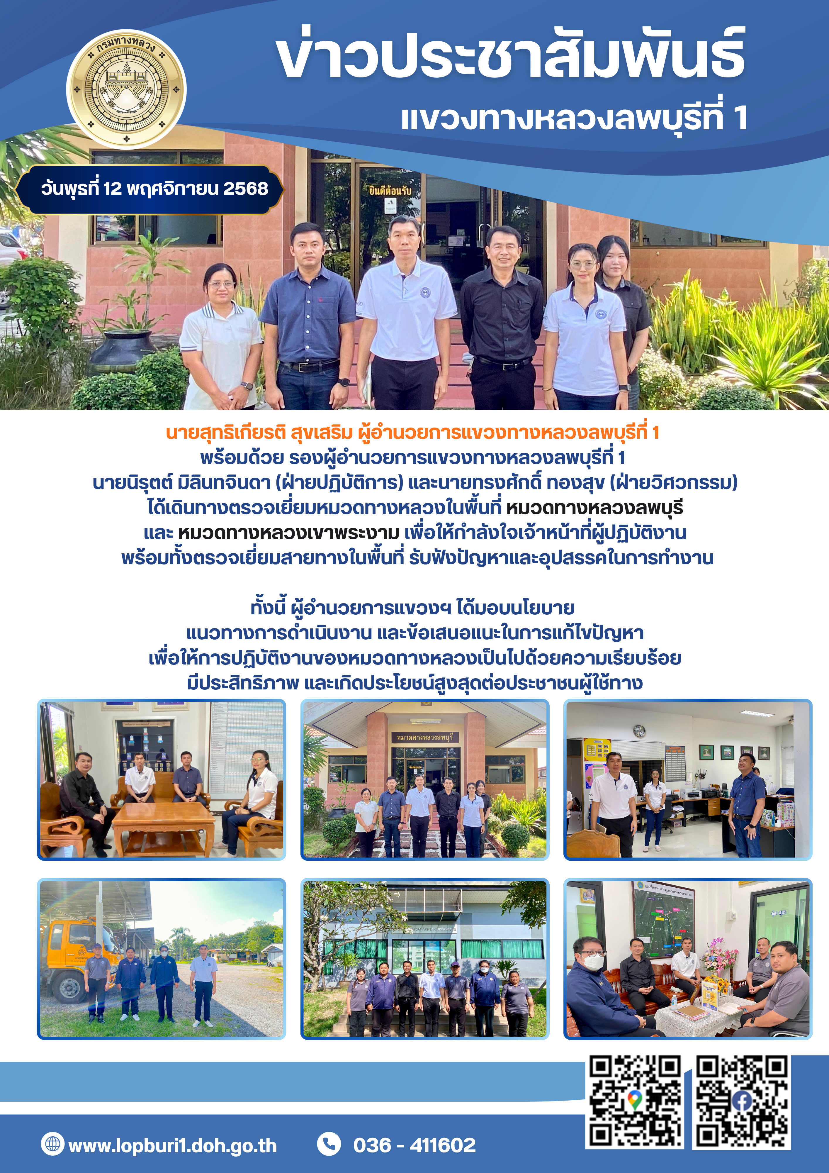 ได้เดินทางตรวจเยี่ยม หมวดทางหลวงลพบุรี และ หมวดทางหลวงเขาพระงาม เพื่อให้กำลังใจเจ้าหน้าที่ผู้ปฏิบัติงาน พร้อมทั้งตรวจเยี่ยมสายทางในพื้นที่ รับฟังปัญหาและอุปสรรคในการทำงาน
