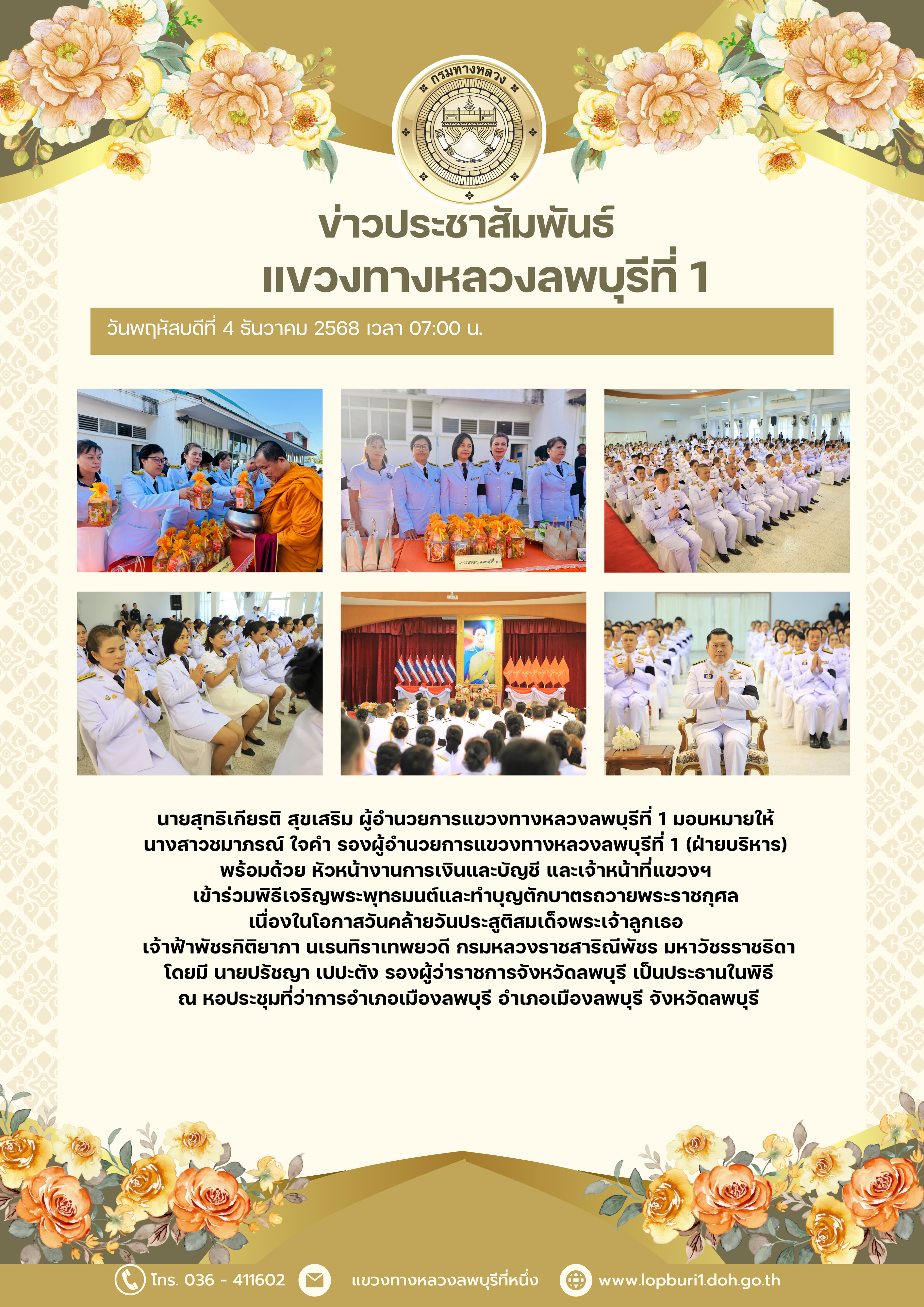 นายสุทธิเกียรติ สุขเสริม ผู้อำนวยการแขวงทางหลวงลพบุรีที่ 1 มอบหมายให้ นางสาวชมาภรณ์ ใจคำ รองผู้อำนวยการแขวงทางหลวงลพบุรีที่ 1 (ฝ่ายบริหาร) พร้อมด้วย หัวหน้างานการเงินและบัญชี และเจ้าหน้าที่แขวงฯ เข้าร่วมพิธีเจริญพระพุทธมนต์และทำบุญตักบาตรถวายพระราชกุศล เนื่องในโอกาสวันคล้ายวันประสูติสมเด็จพระเจ้าลูกเธอ เจ้าฟ้าพัชรกิติยาภา นเรนทิราเทพยวดี กรมหลวงราชสาริณีพัชร มหาวัชรราชธิดา โดยมี นายปรัชญา เปปะตัง รองผู้ว่าราชการจังหวัดลพบุรี เป็นประธานในพิธี ณ หอประชุมที่ว่าการอำเภอเมืองลพบุรี อำเภอเมืองลพบุรี จังหวัดลพบุรี