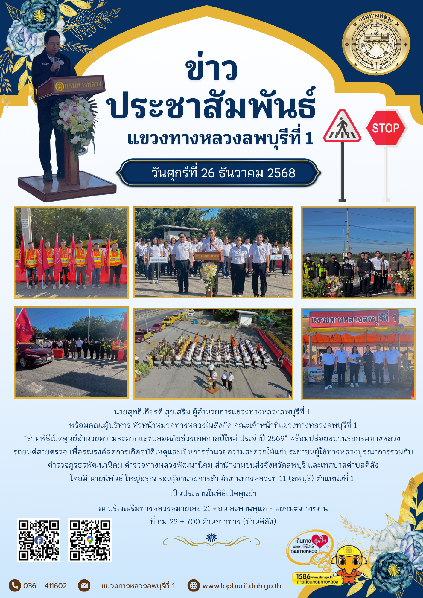 “ร่วมพิธีเปิดศูนย์อำนวยความสะดวกและปลอดภัยช่วงเทศกาลปีใหม่ ประจำปี 2569" พร้อมปล่อยขบวนรถกรมทางหลวง