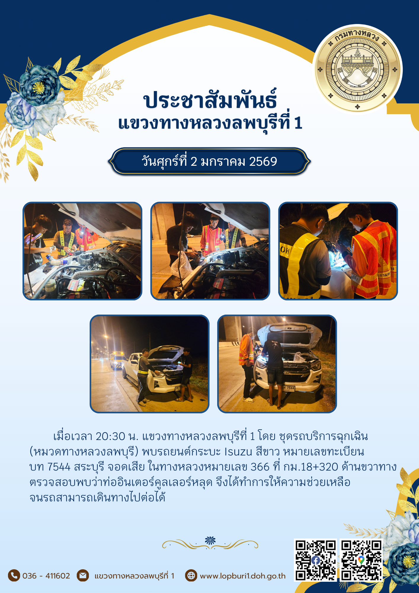 แขวงทางหลวงลพบุรีที่ 1 โดย ชุดรถบริการฉุกเฉิน (หมวดทางหลวงลพบุรี) พบรถยนต์กระบะ Isuzu สีขาว หมายเลขทะเบียน บท 7544 สระบุรี จอดเสีย ในทางหลวงหมายเลข 366 ที่ กม.18+320 ด้านขวาทาง ตรวจสอบพบว่าท่ออินเตอร์คูลเลอร์หลุด จึงได้ทำการให้ความช่วยเหลือ จนรถสามารถเดินทางไปต่อได้
