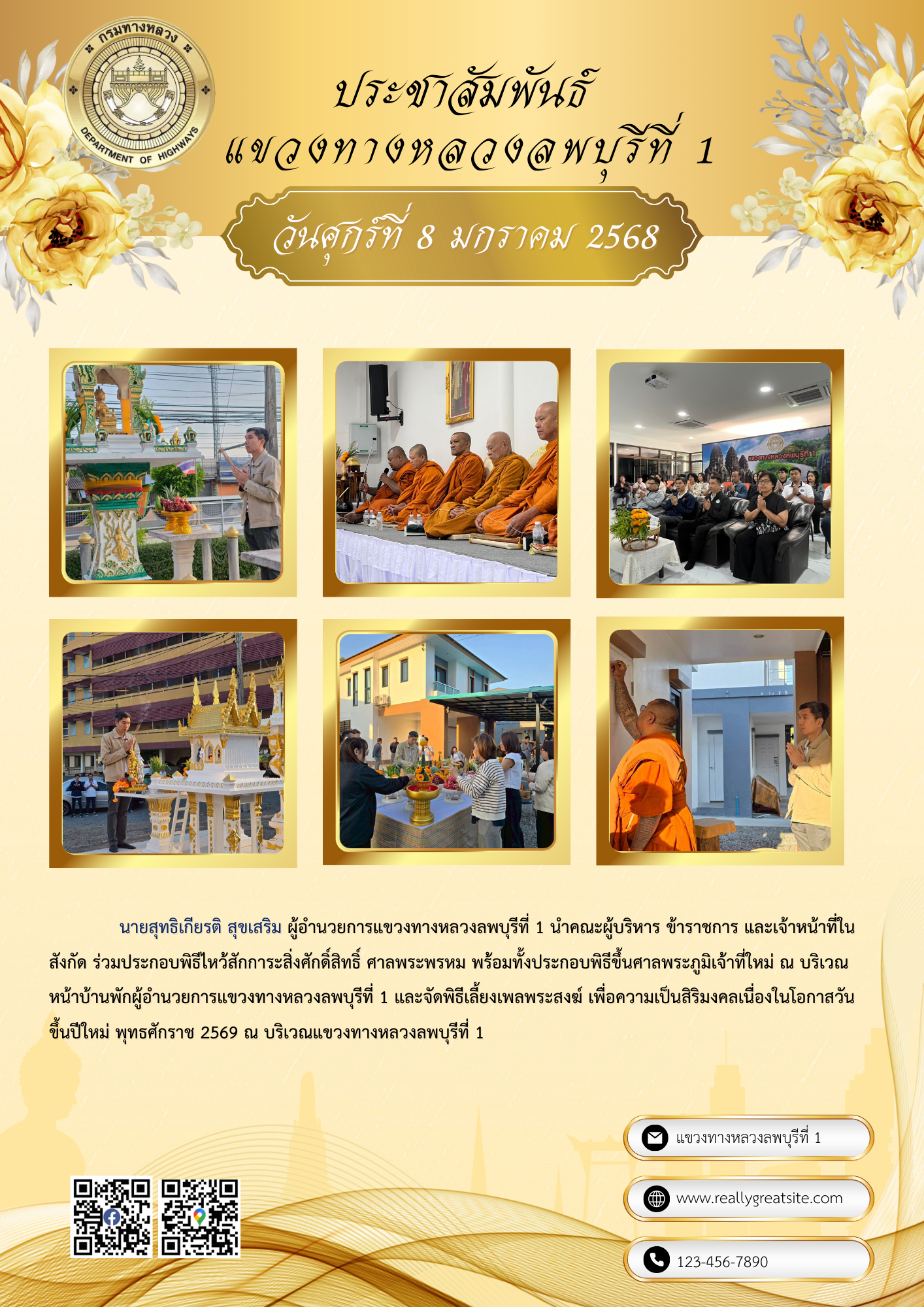 นำคณะผู้บริหาร ข้าราชการ และเจ้าหน้าที่ในสังกัด ร่วมประกอบพิธีไหว้สักการะสิ่งศักดิ์สิทธิ์ ศาลพระพรหม พร้อมทั้งประกอบพิธีขึ้นศาลพระภูมิเจ้าที่ใหม่ ณ บริเวณหน้าบ้านพักผู้อำนวยการแขวงทางหลวงลพบุรีที่ 1 และจัดพิธีเลี้ยงเพลพระสงฆ์ เพื่อความเป็นสิริมงคลเนื่องในโอกาสวันขึ้นปีใหม่ พุทธศักราช 2569 ณ บริเวณแขวงทางหลวงลพบุรีที่ 1