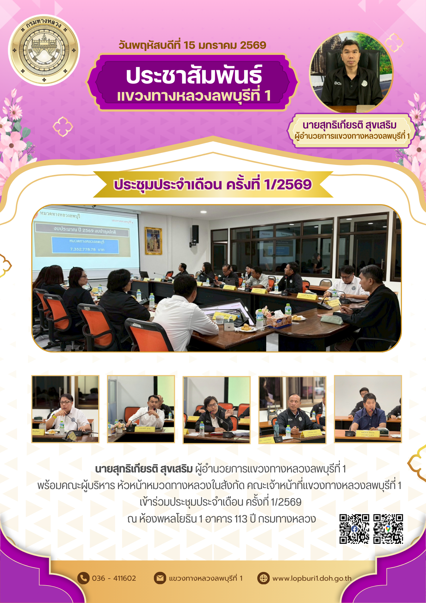 นายสุทธิเกียรติ สุขเสริม ผู้อำนวยการแขวงทางหลวงลพบุรีที่ 1 พร้อมคณะผู้บริหาร หัวหน้าหมวดทางหลวงในสังกัด คณะเจ้าหน้าที่แขวงทางหลวงลพบุรีที่ 1