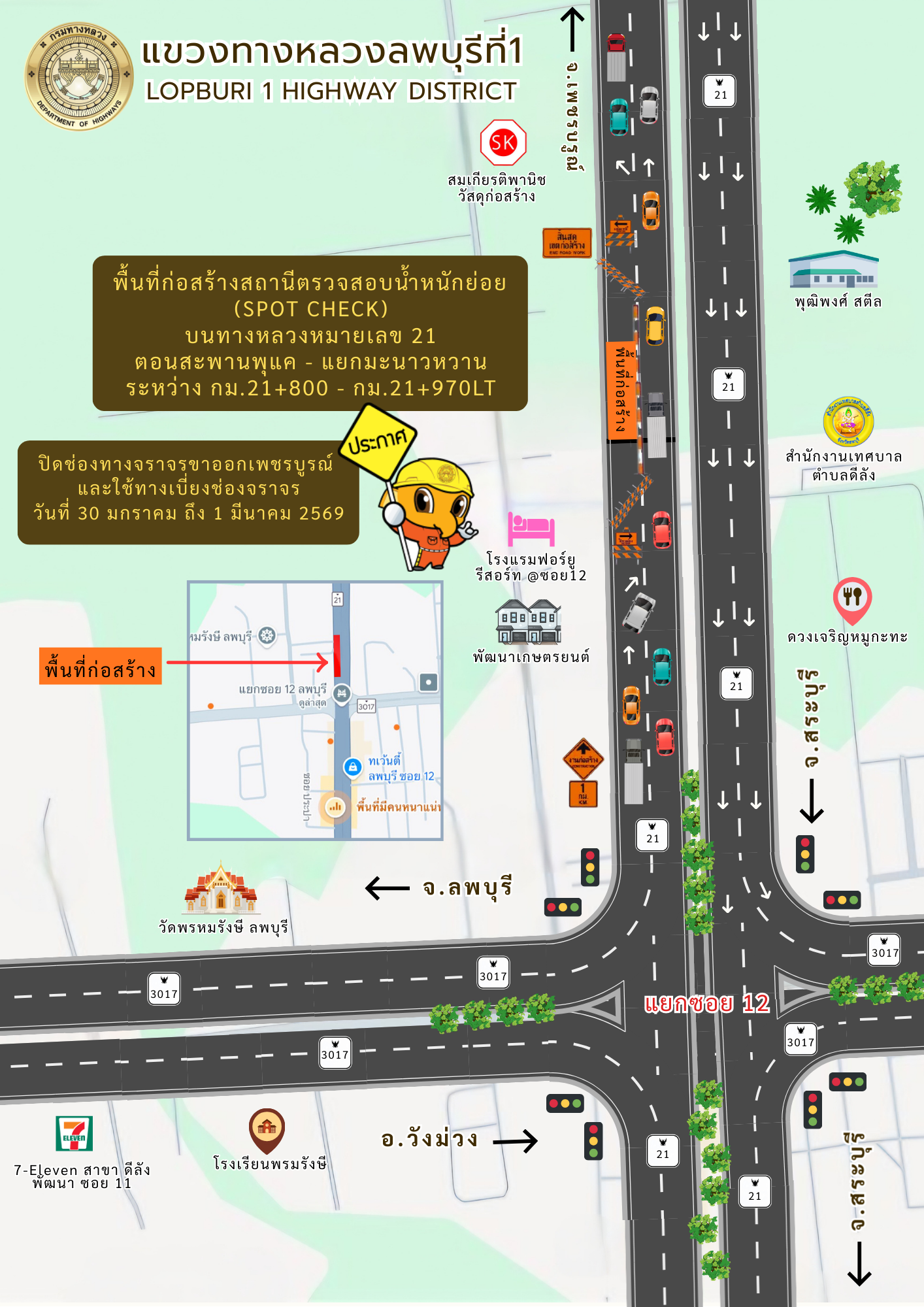 แขวงทางหลวงลพบุรีที่ 1 ขอประชาสัมพันธ์ ปิดการจราจร ช่วงก่อสร้างเป็นการชั่วคราว เพื่อดำเนินการก่อสร้างสถานีตรวจสอบน้ำหนักย่อย (SPOT CHECK) ทางหลวงหมายเลข 21 ตอนสะพานพุแค - แยกมะนาวหวาน ระหว่าง กม.21+800 - กม.21+970 ด้านซ้ายทาง ตั้งแต่วันที่ 30 มกราคม - วันที่ 1 มีนาคม 2569 ตลอด 24 ชั่วโมง ขออภัยในความไม่สะดวก