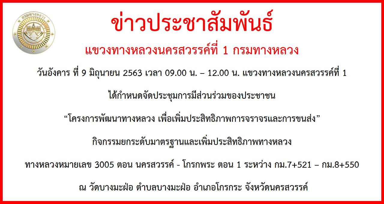 ข้อมูลข่าว : ข่าวประชาสัมพันธ์ กิจกรรมยกระดับมาตรฐานและเพิ่มประสิทธิภาพทางหลวง ทล.3005 ตอน นครสวรรค์ - โกรกพระ ตอนที่ 1 กม.7+521 - กม.8+550
