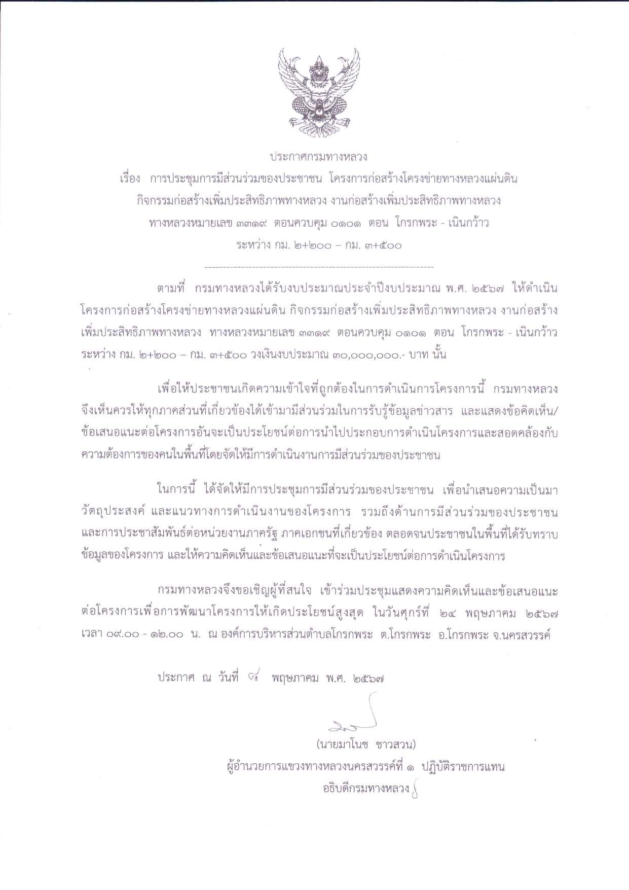 ข้อมูลข่าว : การประชุมการมีส่วนร่วมของประชาชน โครงการก่อสร้างโครงข่ายทางหลวงแผ่นดิน กิจกรรมก่อสร้างเพิ่มประสิทธิภาพทางหลวง งานก่อสร้างเพิ่มประสิทธิภาพทางหลวง ทางหลวงหมายเลข 3319 ตอนควบคุม 0101 ตอน โกรกพระ – เนินกว้าว ระหว่าง กม. 2+200 - กม. 3+500