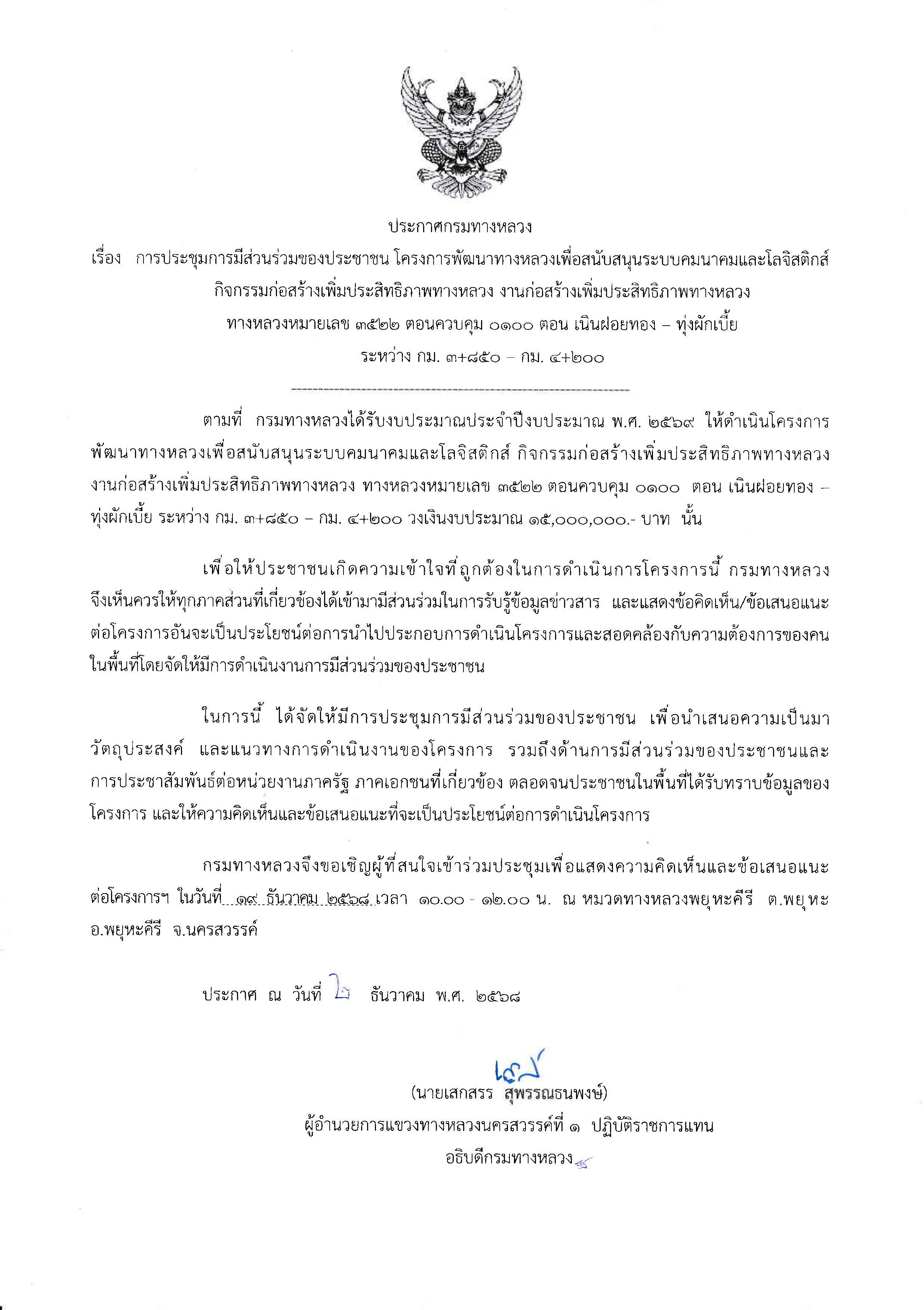 ข้อมูลข่าว : การประชุมการมีส่วนร่วมของประชาชน โครงการพัฒนาทางหลวงเพื่อสนับสนุนระบบคมนาคมและโลจิสติกส์ กิจกรรมก่อสร้างเพิ่มประสิทธิภาพทางหลวง งานก่อสร้างเพิ่มประสิทธิภาพทางหลวง ทางหลวงหมายเลข 3522 ตอนควบคุม 0100 ตอน เนินฝอยทอง – ทุ่งผักเบี้ย ระหว่าง กม. 3+850 – กม. 4+200