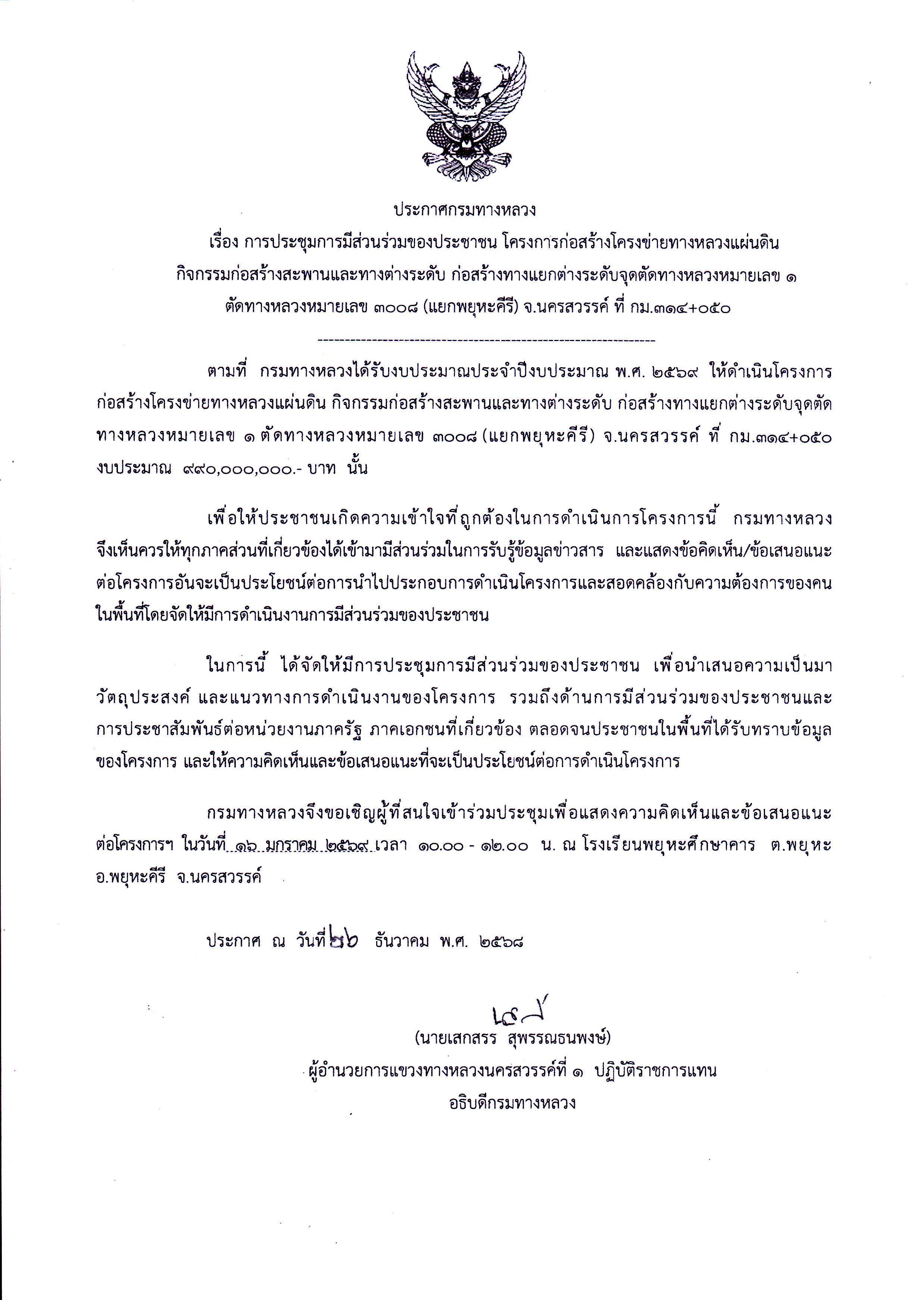 ข้อมูลข่าว : การประชุมการมีส่วนร่วมของประชาชน โครงการก่อสร้างโครงข่ายทางหลวงแผ่นดิน กิจกรรมก่อสร้างสะพานและทางต่างระดับ ก่อสร้างทางแยกต่างระดับจุดตัดทางหลวงหมายเลข 1 ตัดทางหลวงหมายเลข 3008 (แยกพยุหะคีรี) จ.นครสวรรค์ ที่ กม.314+050