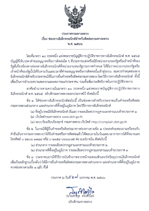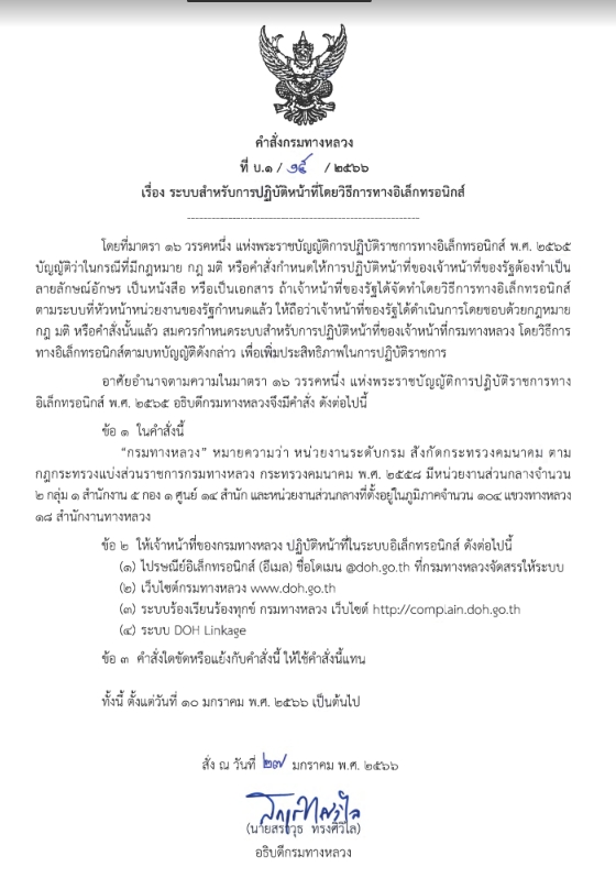 การเผยแพร่ประกาศกรมทางหลวง เรื่อง ช่องทางอิเล็กทรอนิกส์สำหรับติดต่อกรมทางหลวง พ.ศ. 2566 และคำสั่งกรมทางหลวง เรื่อง ระบบสำหรับการปฏิบัติหน้าที่โดยวิธีอิเล็กทรอนิกส์