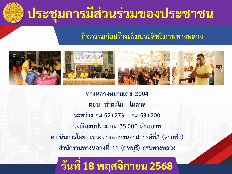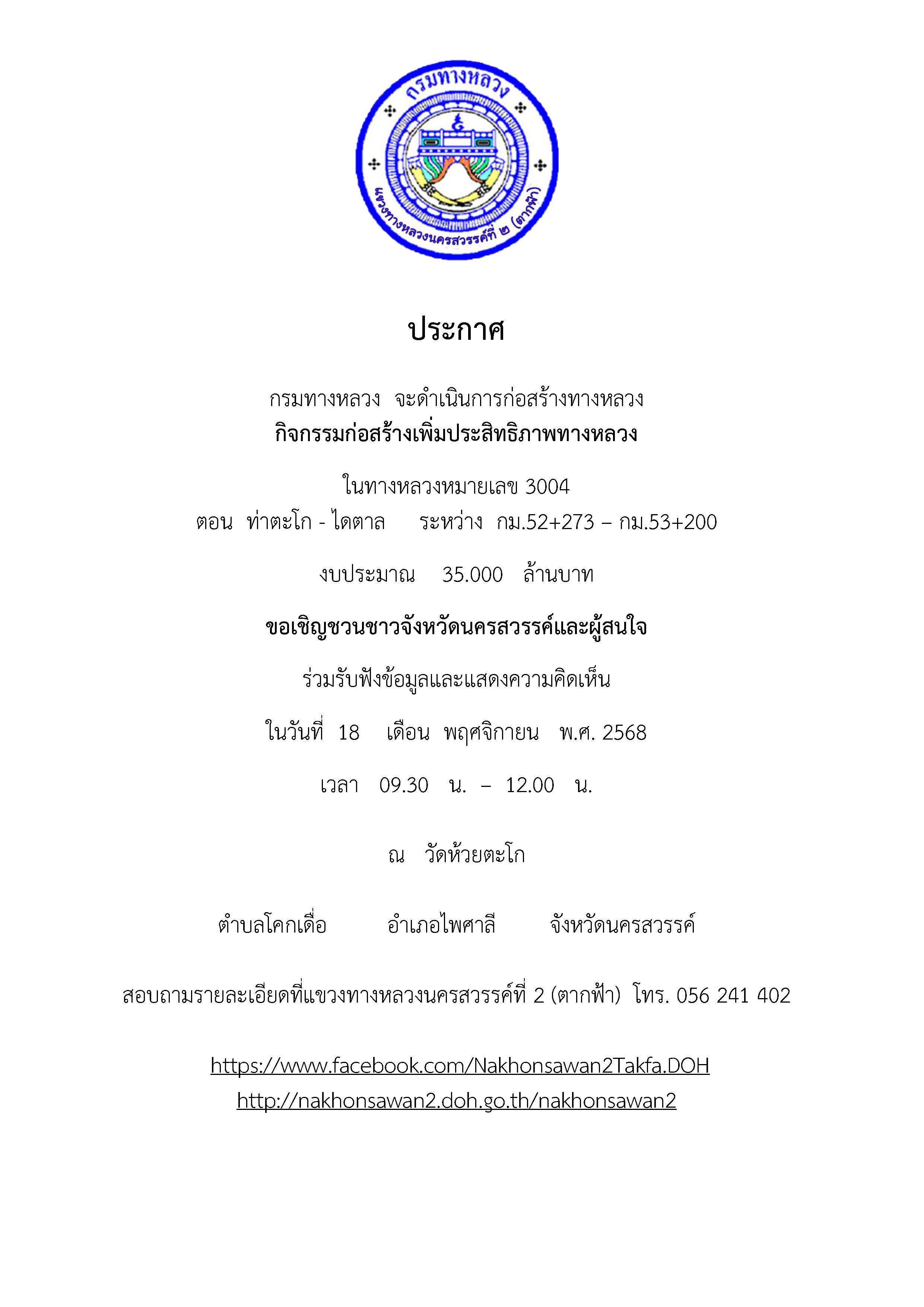 ขอเชิญชวนชาว อ.ท่าตะโก , อ.เมือง ,อ.ไพศาลี และ อ.ตากฟ้า จังหวัดนครสวรรค์และผู้สนใจ ร่วมรับฟังข้อมูลและแสดงความคิดเห็น กรมทางหลวง จะดำเนินการก่อสร้างเพิ่มประสิทธิภาพทางหลวง