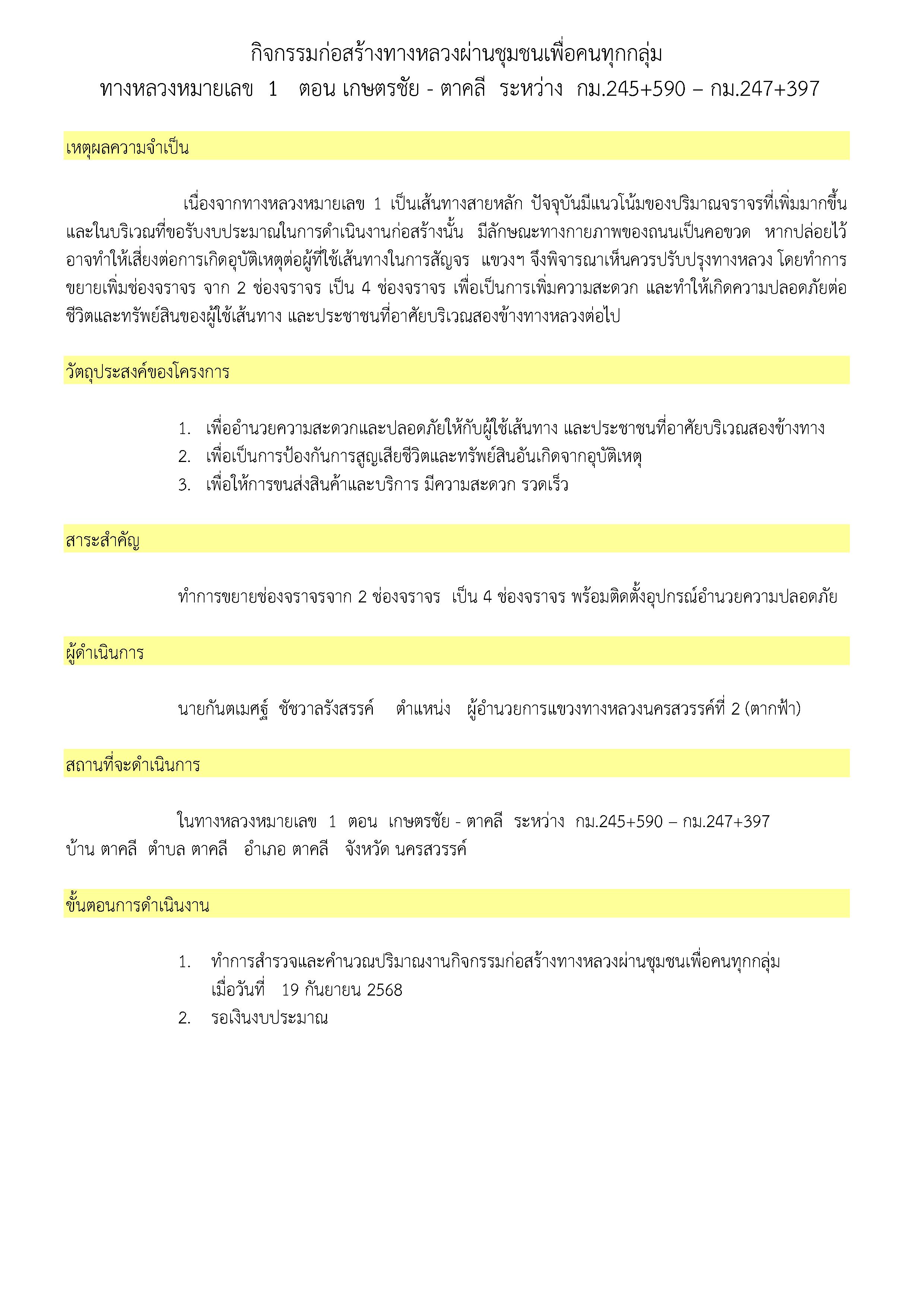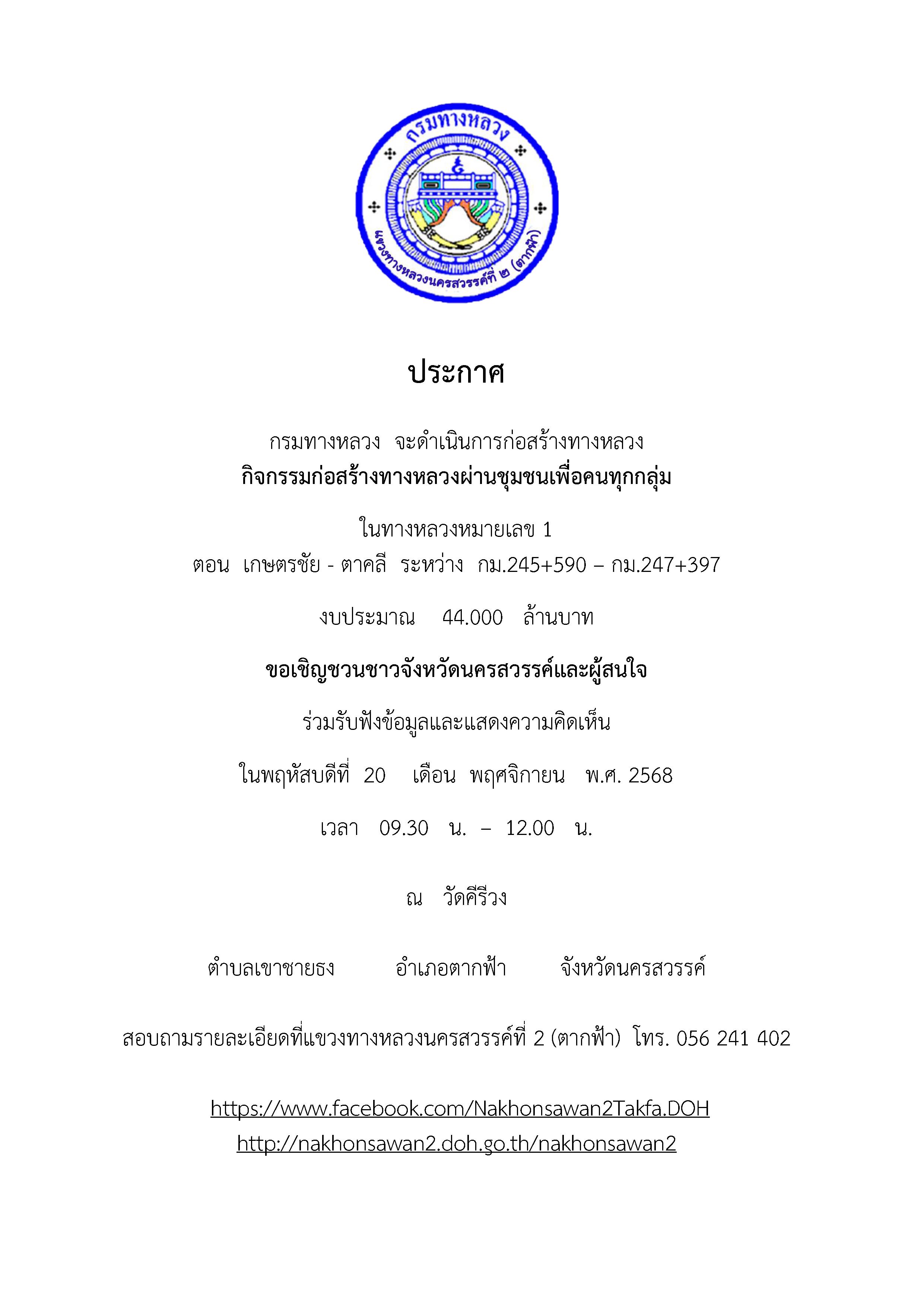 ขอเชิญชวนชาว อ.ตาคลี และ อ.ตากฟ้า จังหวัดนครสวรรค์และผู้สนใจ ร่วมรับฟังข้อมูลและแสดงความคิดเห็น กรมทางหลวง จะดำเนินการก่อสร้างทางหลวงผ่านย่านชุมชนเพื่อคนทุกกลุ่ม