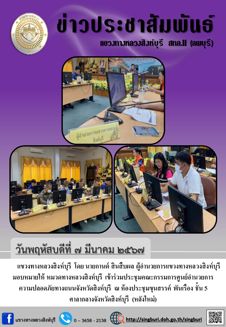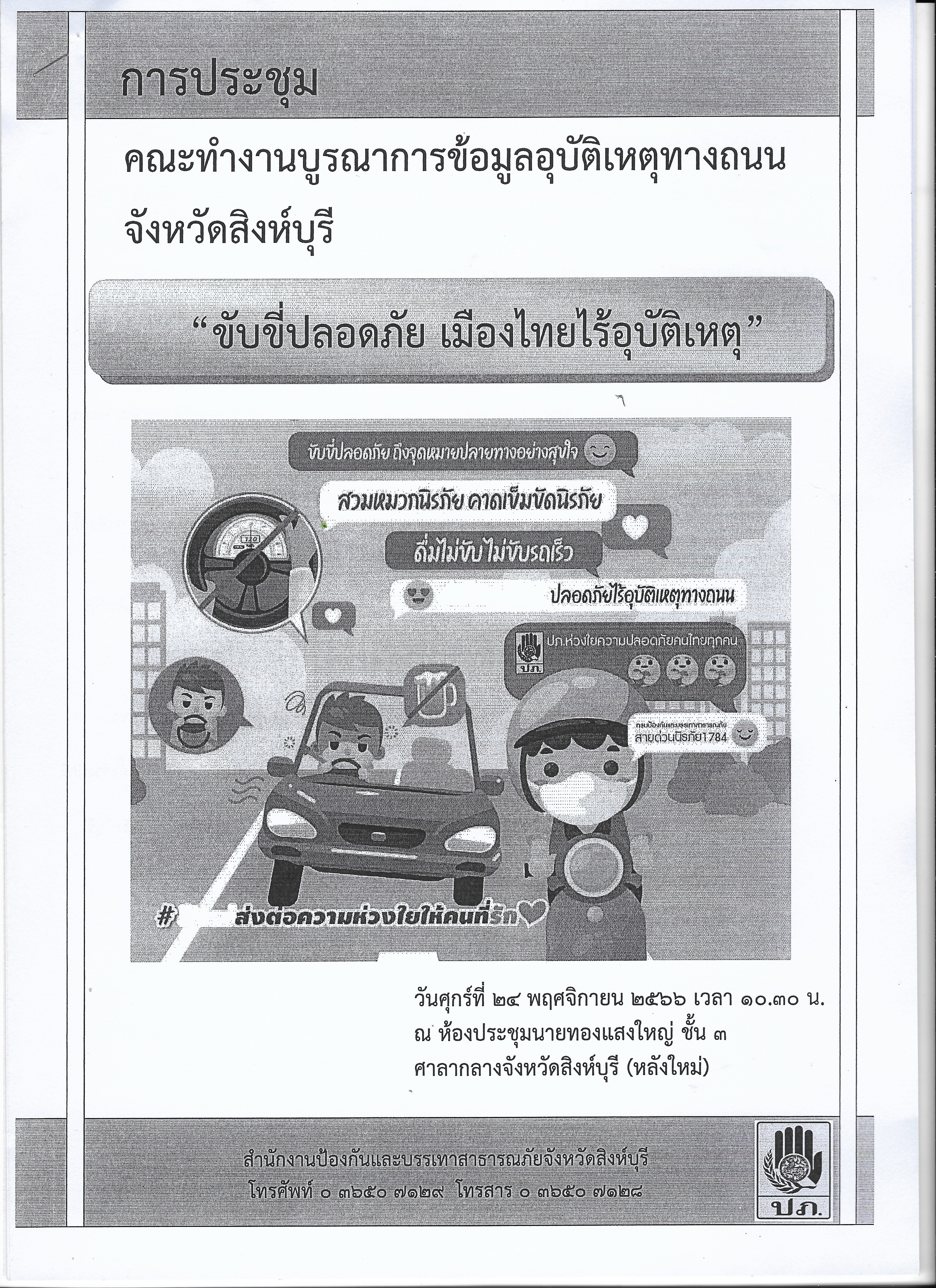 นางประภาศิริ อ้วนศรี ตำแหน่งเจ้าพนักงานสถิติชำนาญงาน เข้าร่วมการประชุมคณะทำงานบูรณาการข้อมูลอุบัติเหตุทางถนนจังหวัดสิงห์บุรี ณ ห้องประชุมนายทองแสงใหญ่ ชั้น ๓ ศาลากลางจังหวัดสิงห์บุรี (หลังใหม่)