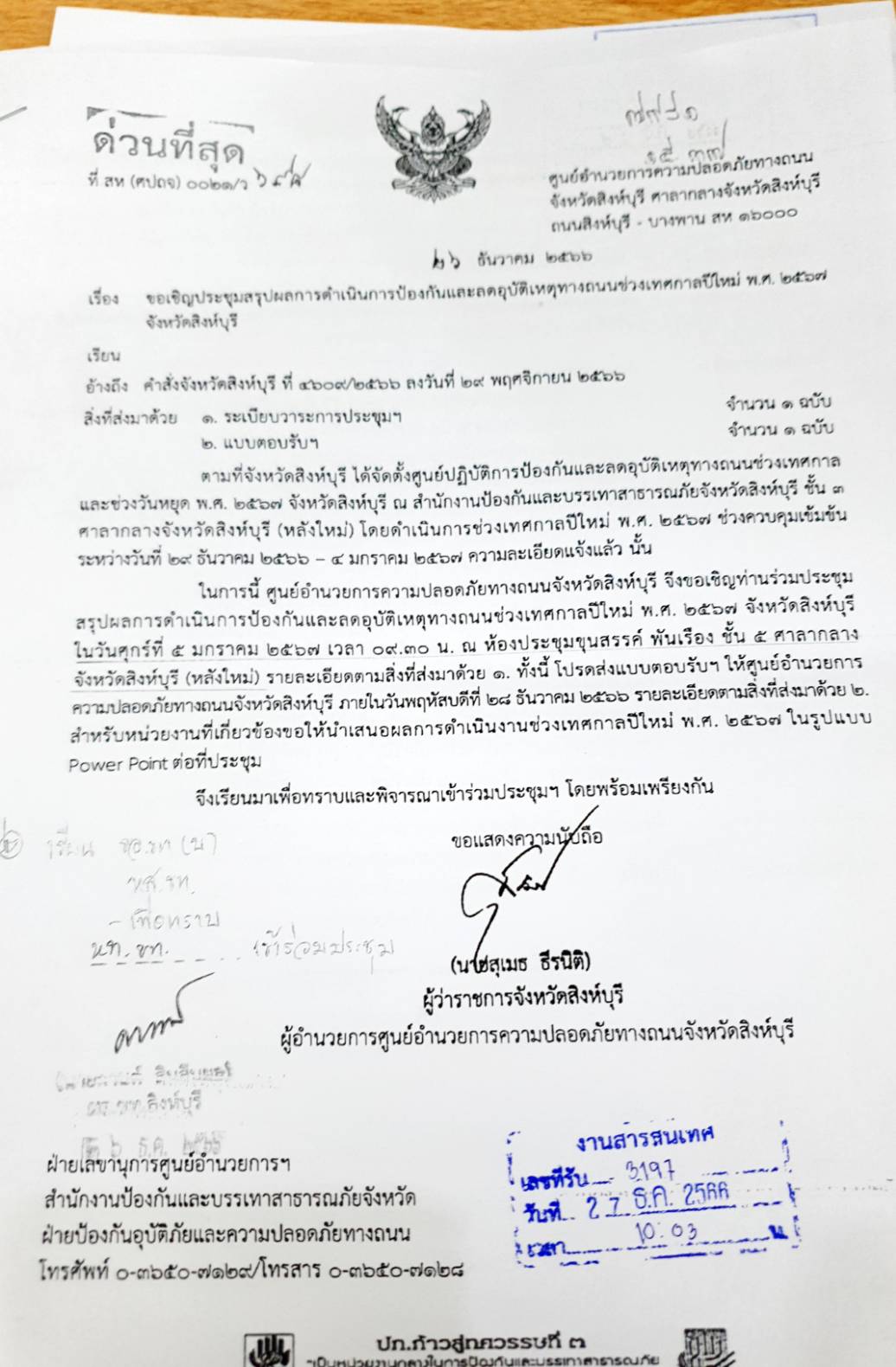แขวงทางหลวงสิงห์บุรี โดย นายกานต์ สินสืบผล ผู้อำนวยการแขวงทางหลวงสิงห์บุรี มอบหมายให้ นางประภาศิริ อ้วนศรี ตำแหน่งเจ้าพนักงานสถิติชำนาญงาน เข้าร่วมการประชุมสรุปผลการดำเนินการป้องกันและลดอุบัติเหตุทางถนน ช่วงเทศกาลปีใหม่ 2567 ณ ห้องประชุมขุนสรรค์ พันเรือง ชั้น 5 ศาลากลางจังหวัดสิงห์บุรี(หลังใหม่)