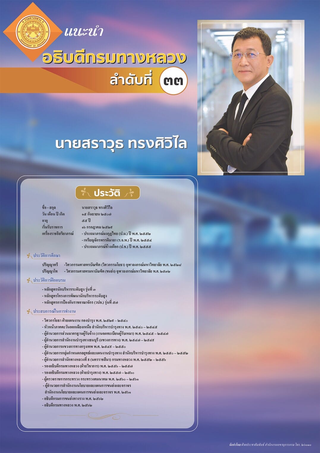 นายสราวุธ ทรงศิวิไล อธิบดีกรมทางหลวง ลำดับที่ ๓๓