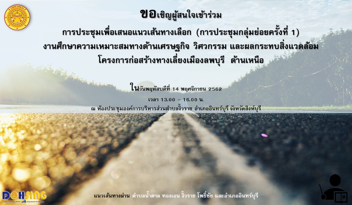 ขอเชิญประชาชนในพื้นที่ฯ เข้าร่วมประชุมกลุ่มย่อย ครั้งที่ 1 โครงการก่อสร้างทางเลี่ยงเมืองลพบุรี