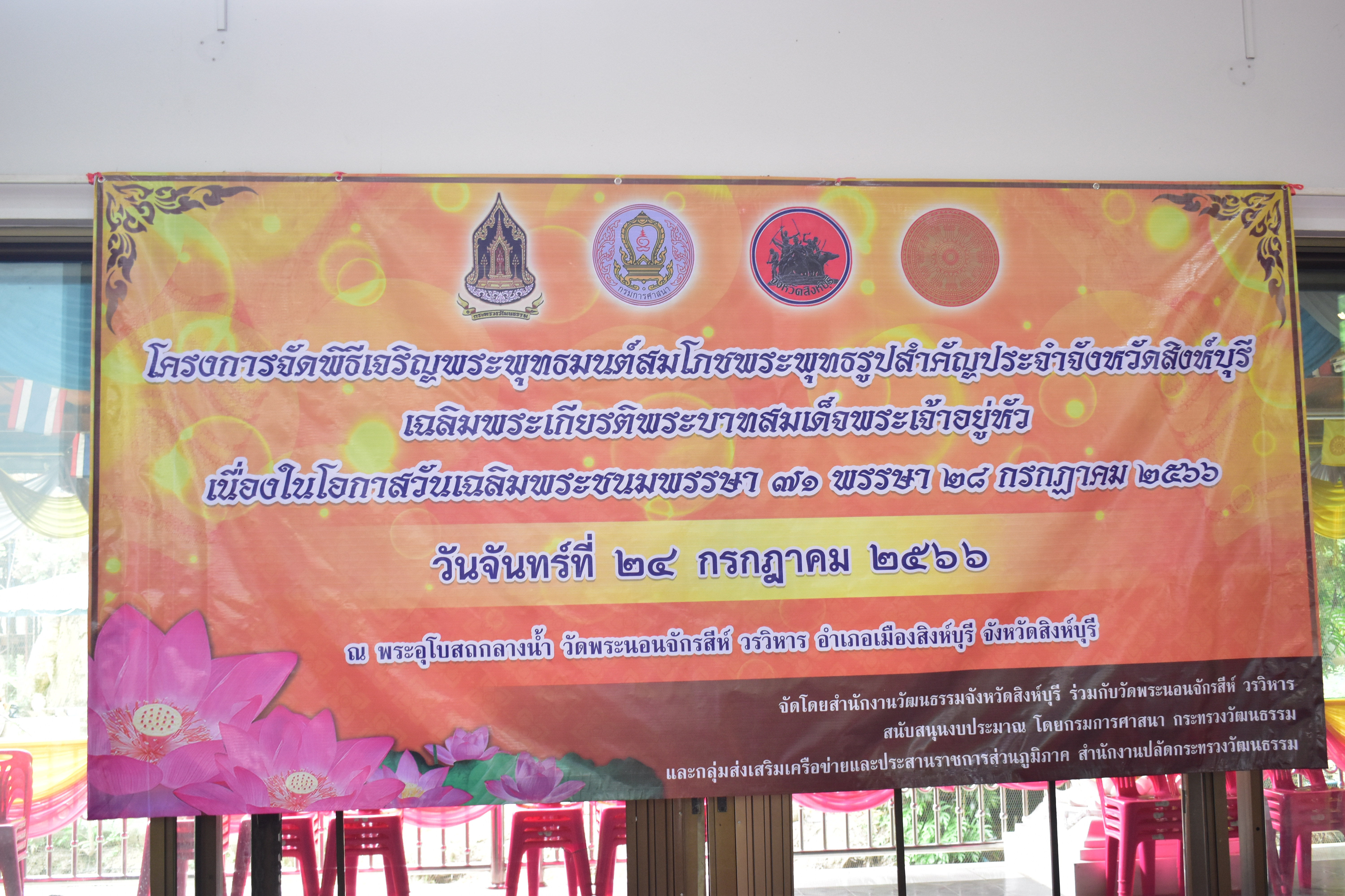 24 กรกฎาคม 2566 แขวงทางหลวงสิงห์บุรี โดย นายกานต์ สินสืบผล มอบหมายให้ งานสารสนเทศ เข้าร่วม พิธีเจริญพระพุทธมนต์สมโภชพระพุทธรูปสำคัญประจำจังหวัดสิงห์บุรี เฉลิมพระเกียรติพระบามสมเด็จพระเจ้าอยู่หัว เนื่องในโอกาสวันเฉลิมพระชนมพรรษา 28 กรกฎาคม ณ พระอุโบสถกลางน้ำ วัดพระนอนจักรสีห์ วรวิหาาร อำเภอเมืองสิงห์บุรี จังหวัิดสิงห์บุรี