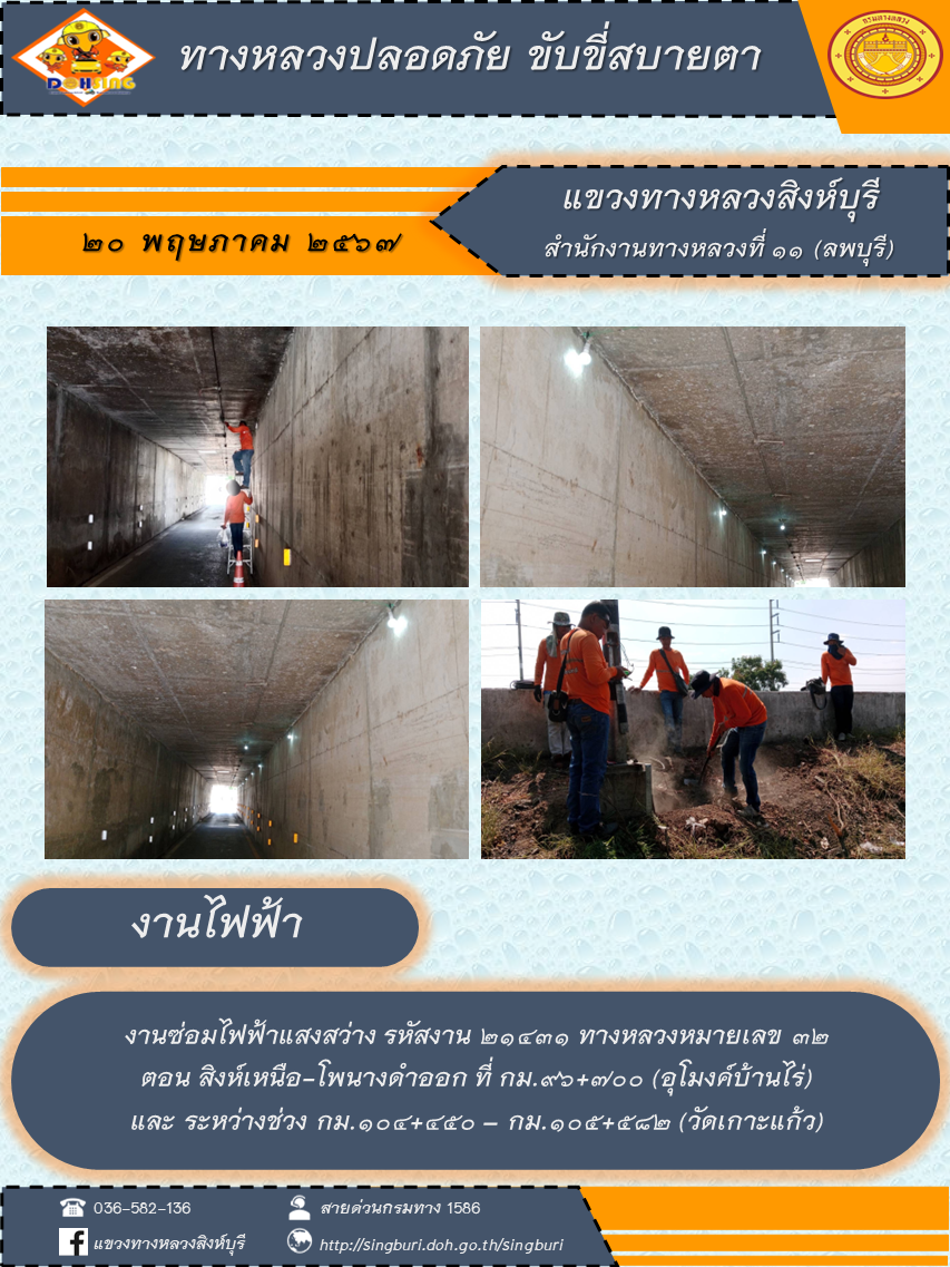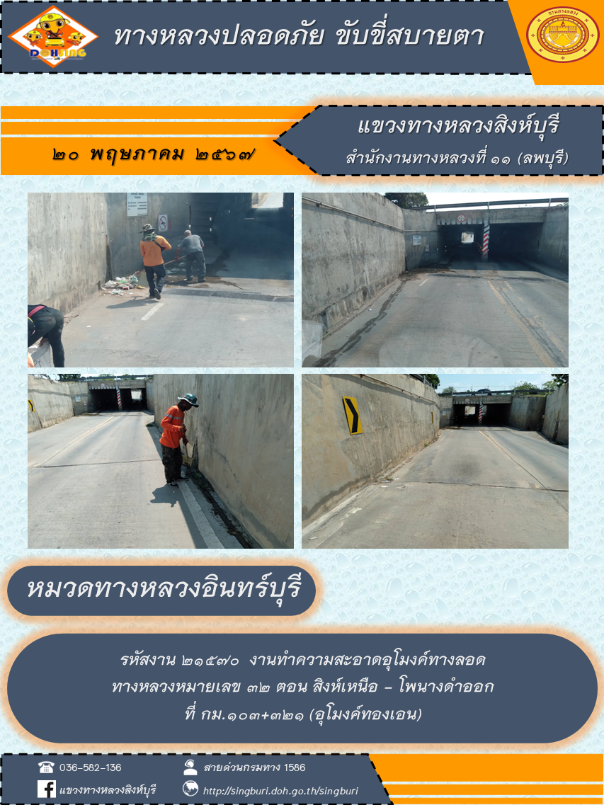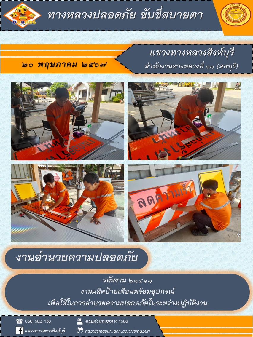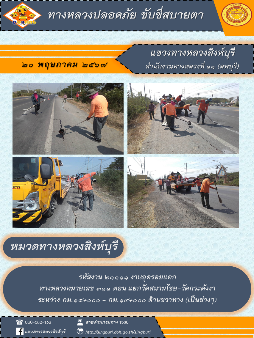 ข้อมูลภาพกิจกรรม : ประชาสัมพันธ์ วันที่ 20 พฤษภาคม 2567 ผลการปฏิบัติงาน ตั้งแต่วันที่ 13 - 17 พฤษภาคม 2567 แขวงทางหลวงสิงห์บุรี