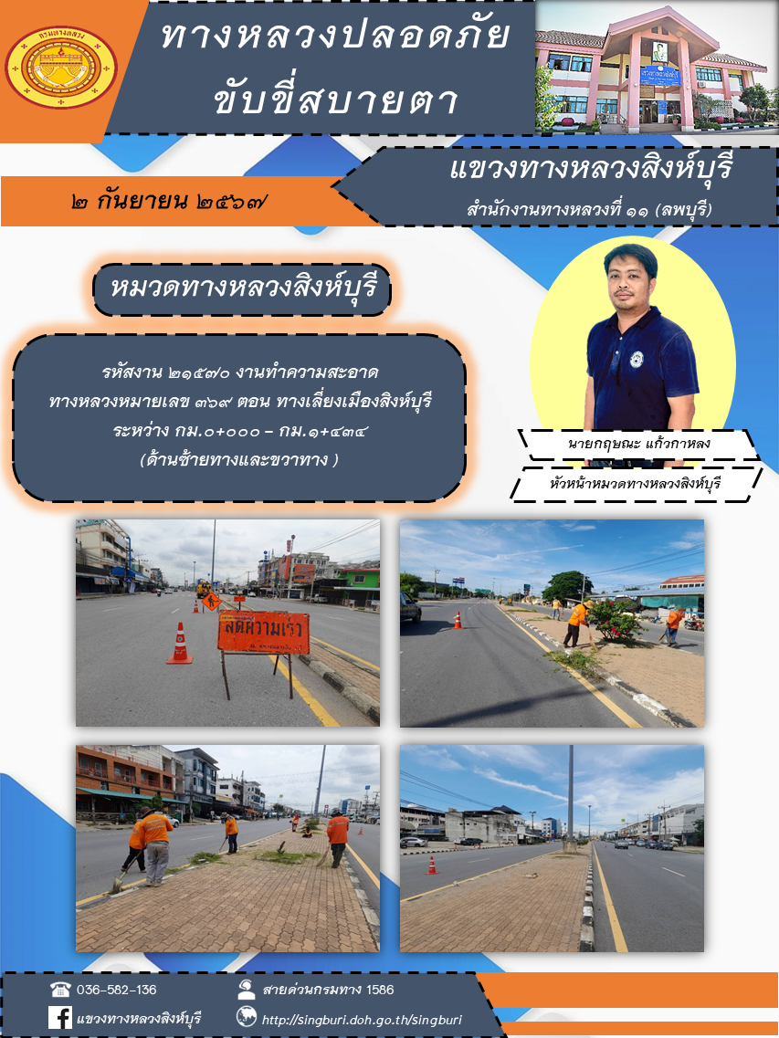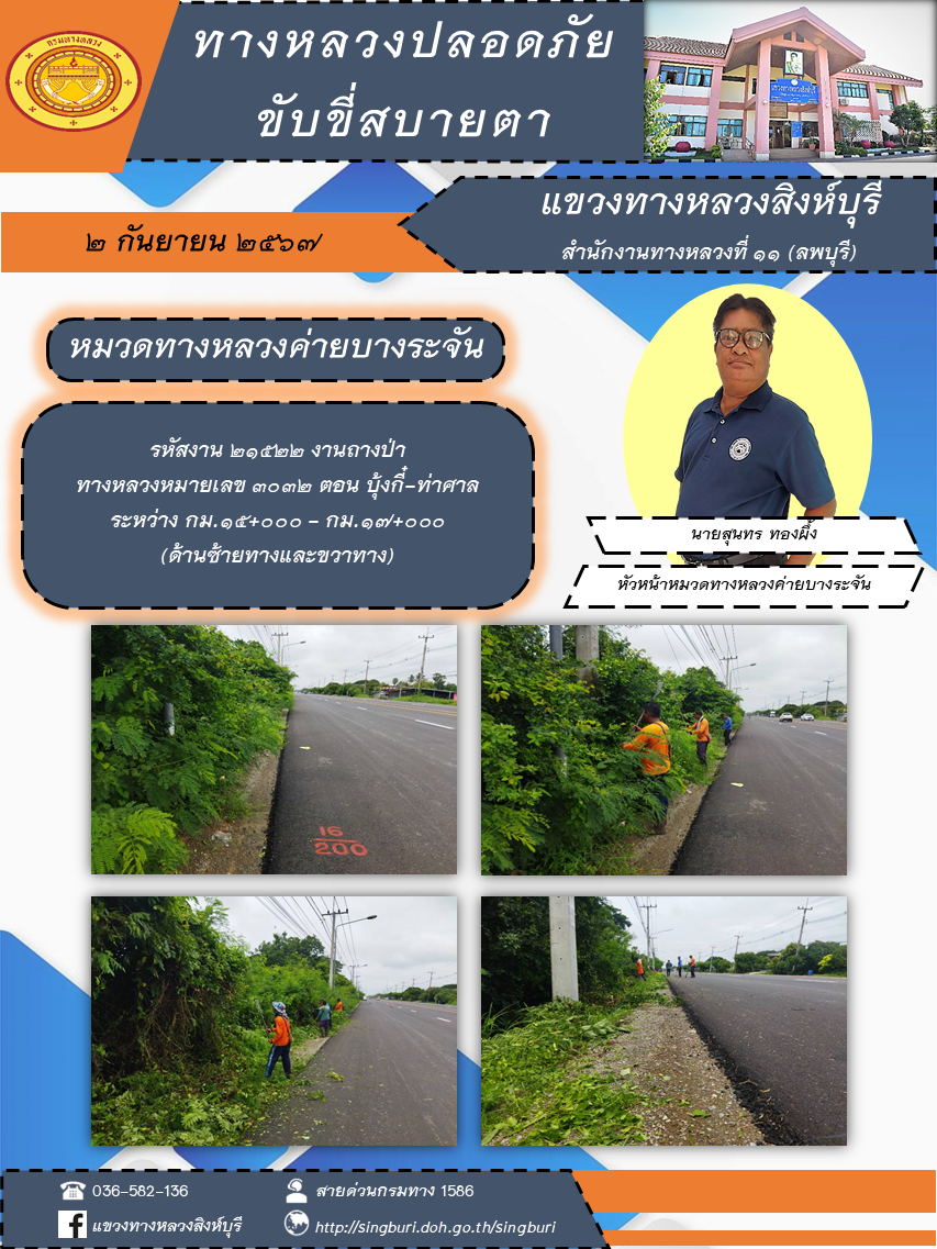 ข้อมูลภาพกิจกรรม : ??ประชาสัมพันธ์ วันจันทร์ที่ 2 กันยายน 2567 ผลการปฏิบัติงาน ตั้งแต่วันที่ 26-30 สิงหาคม 2567 แขวงทางหลวงสิงห์บุรี