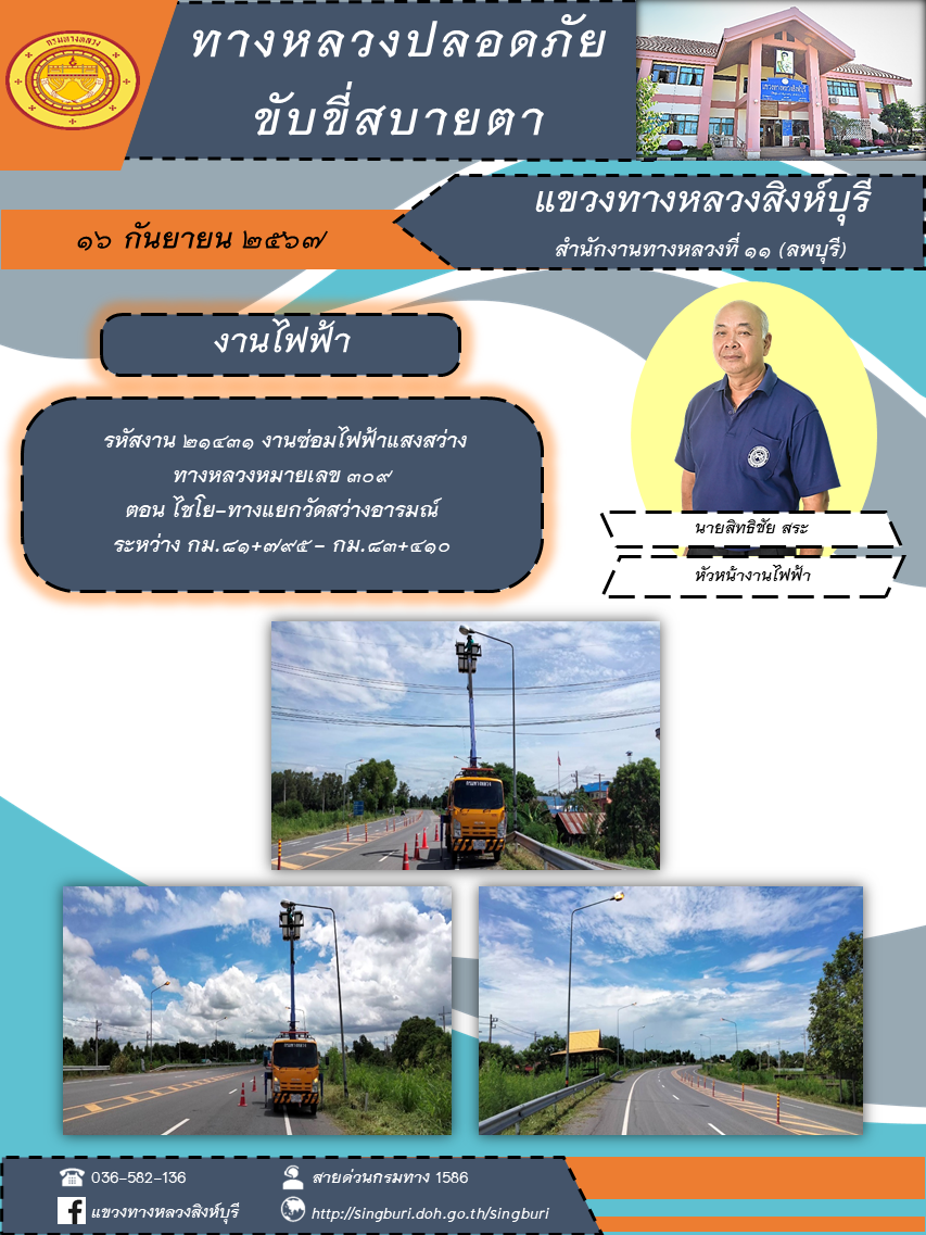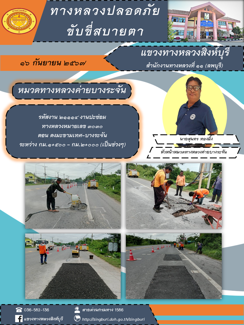 ข้อมูลภาพกิจกรรม : ผลการปฏิบัติงาน ตั้งแต่วันที่ 9-13 กันยายน 2567 แขวงทางหลวงสิงห์บุรี