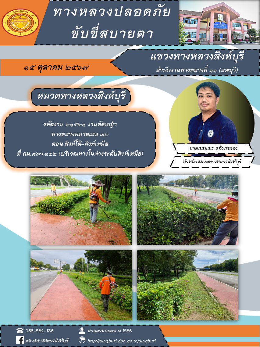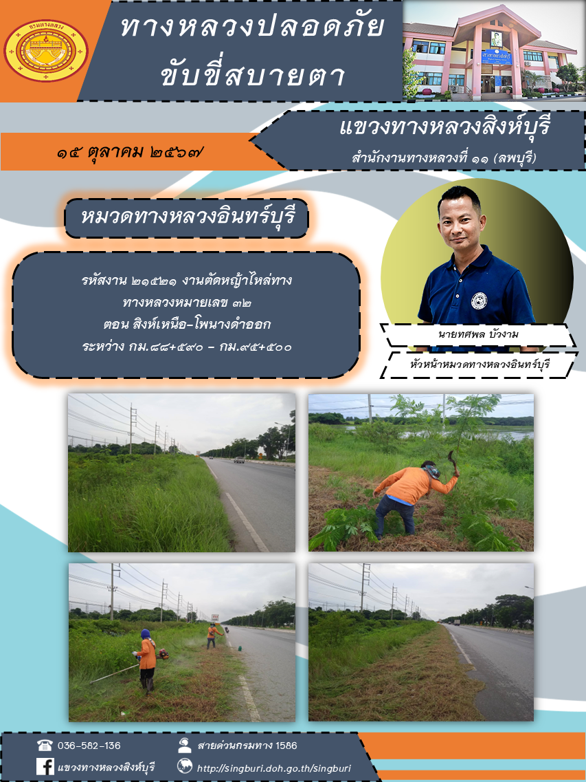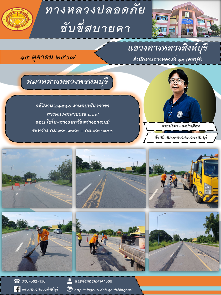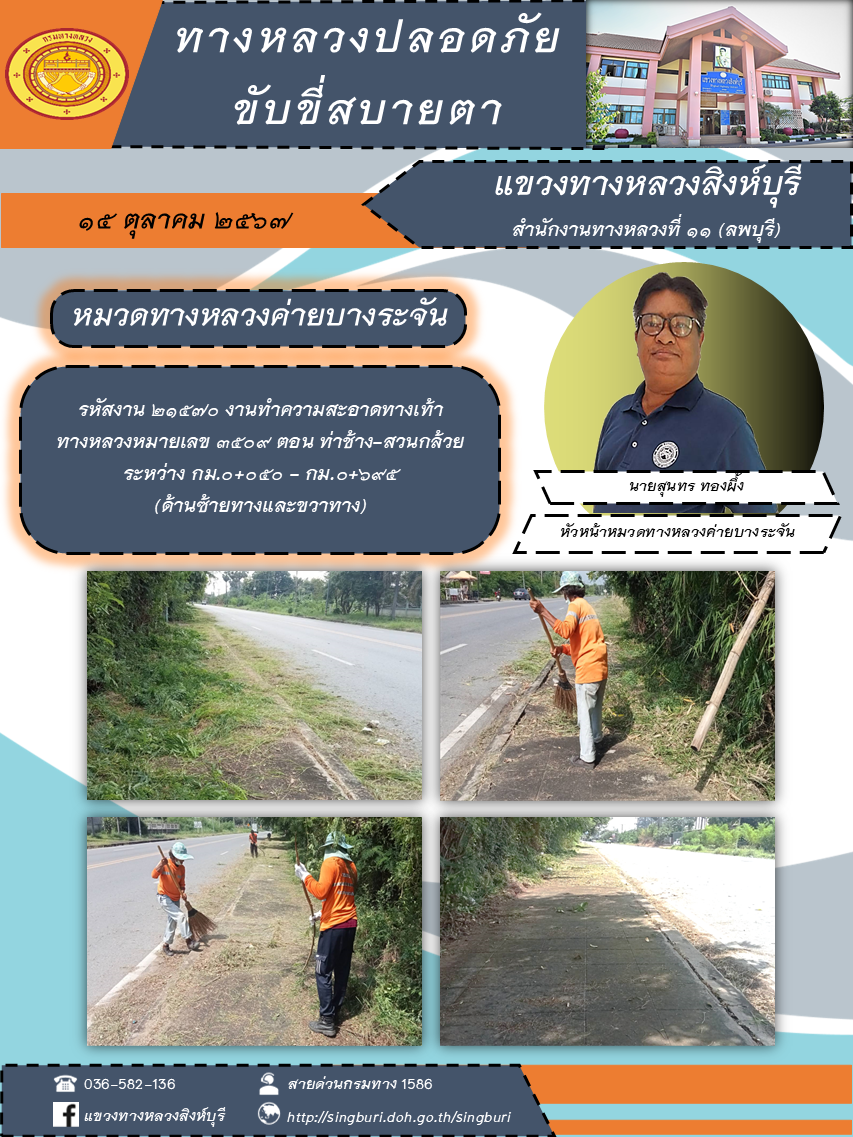 ข้อมูลภาพกิจกรรม : ผลการปฏิบัติงาน ตั้งแต่วันที่ 7 - 11 ตุลาคม 2567 แขวงทางหลวงสิงห์บุรี