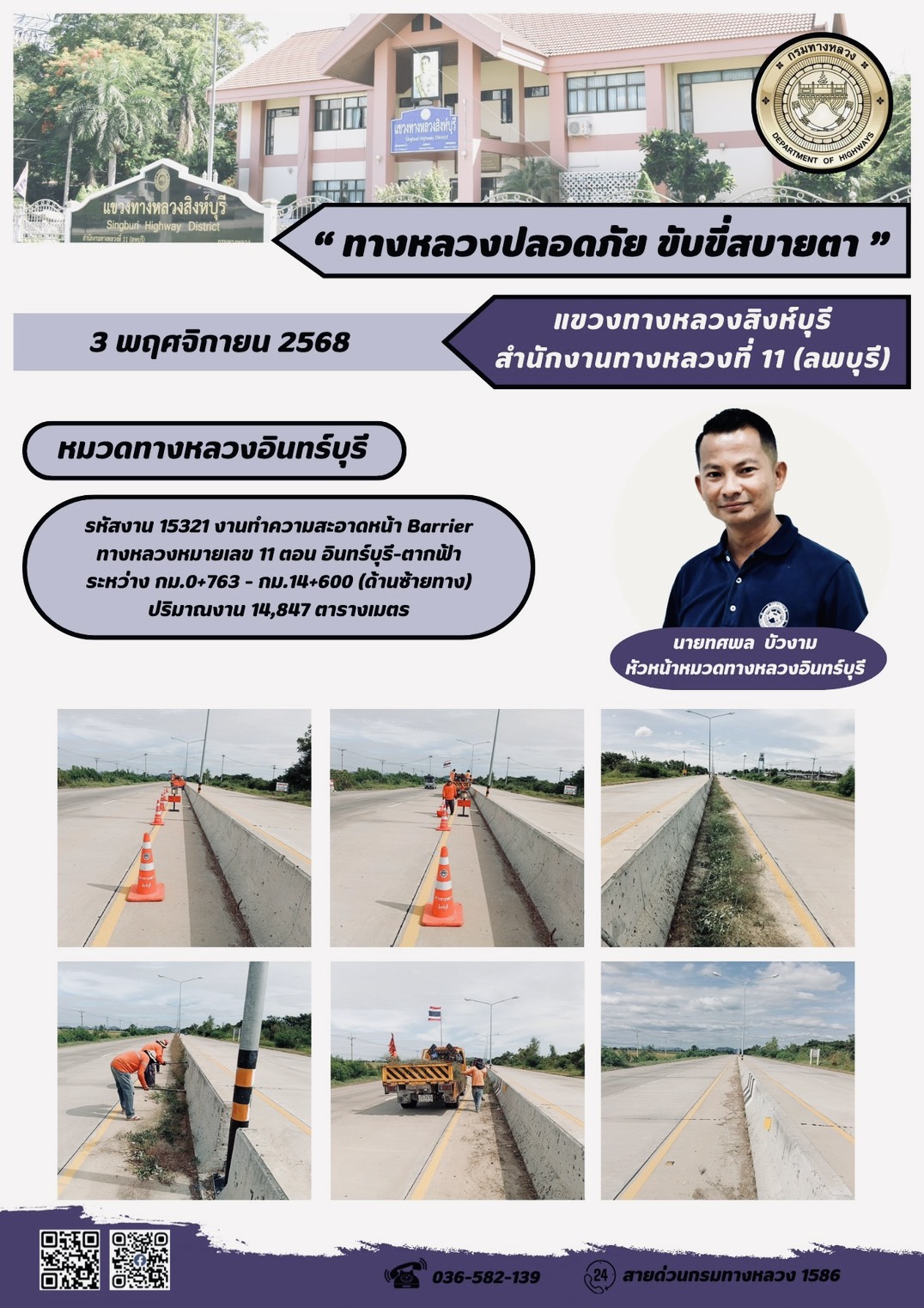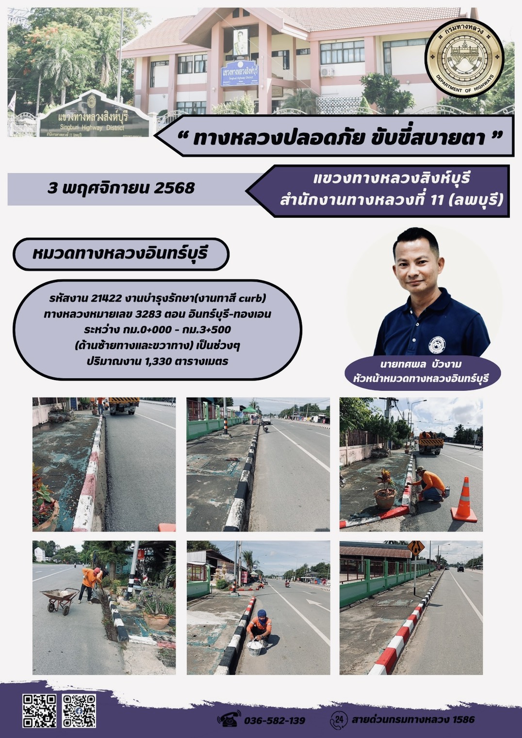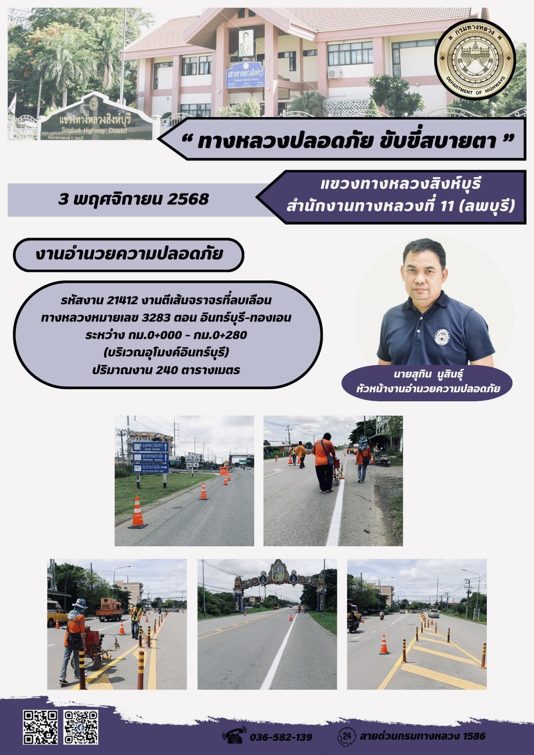 ผลการปฏิบัติงานวันที่ 23-29 ตุลาคม 2568 แขวงทางหลวงสิงห์บุรี สำนักงานทางหลวงที่ 11(ลพบุรี) กรมทางหลวง