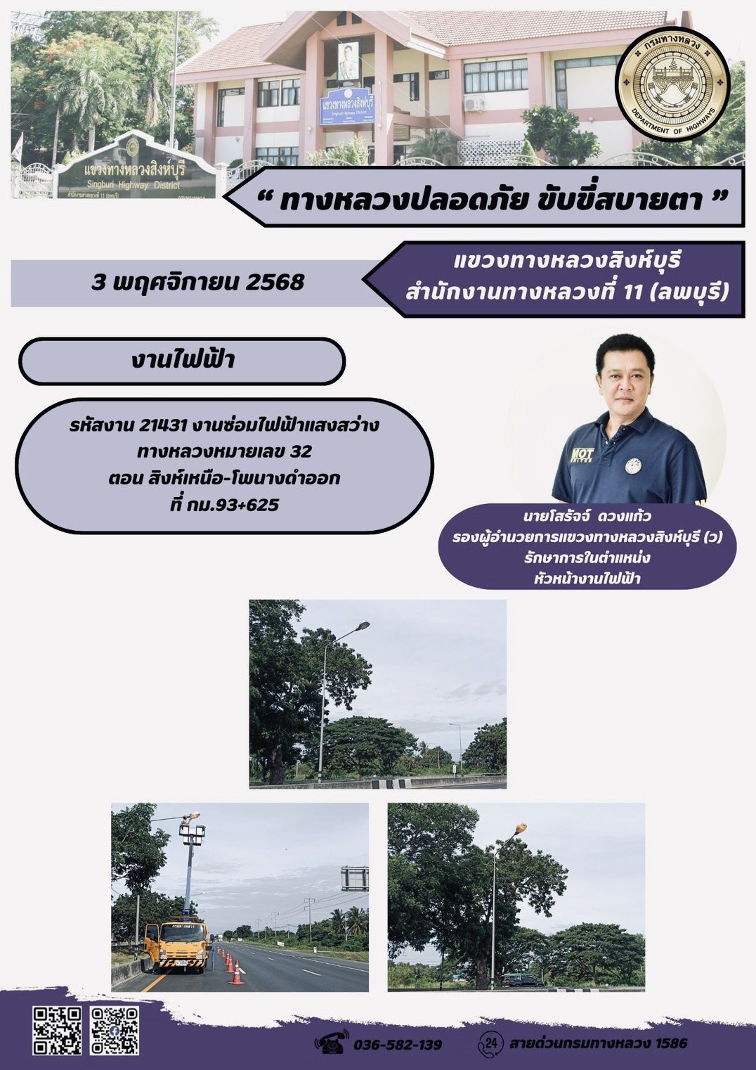 ข้อมูลภาพกิจกรรม : ผลการปฏิบัติงานวันที่ 23-29 ตุลาคม 2568 แขวงทางหลวงสิงห์บุรี สำนักงานทางหลวงที่ 11(ลพบุรี) กรมทางหลวง