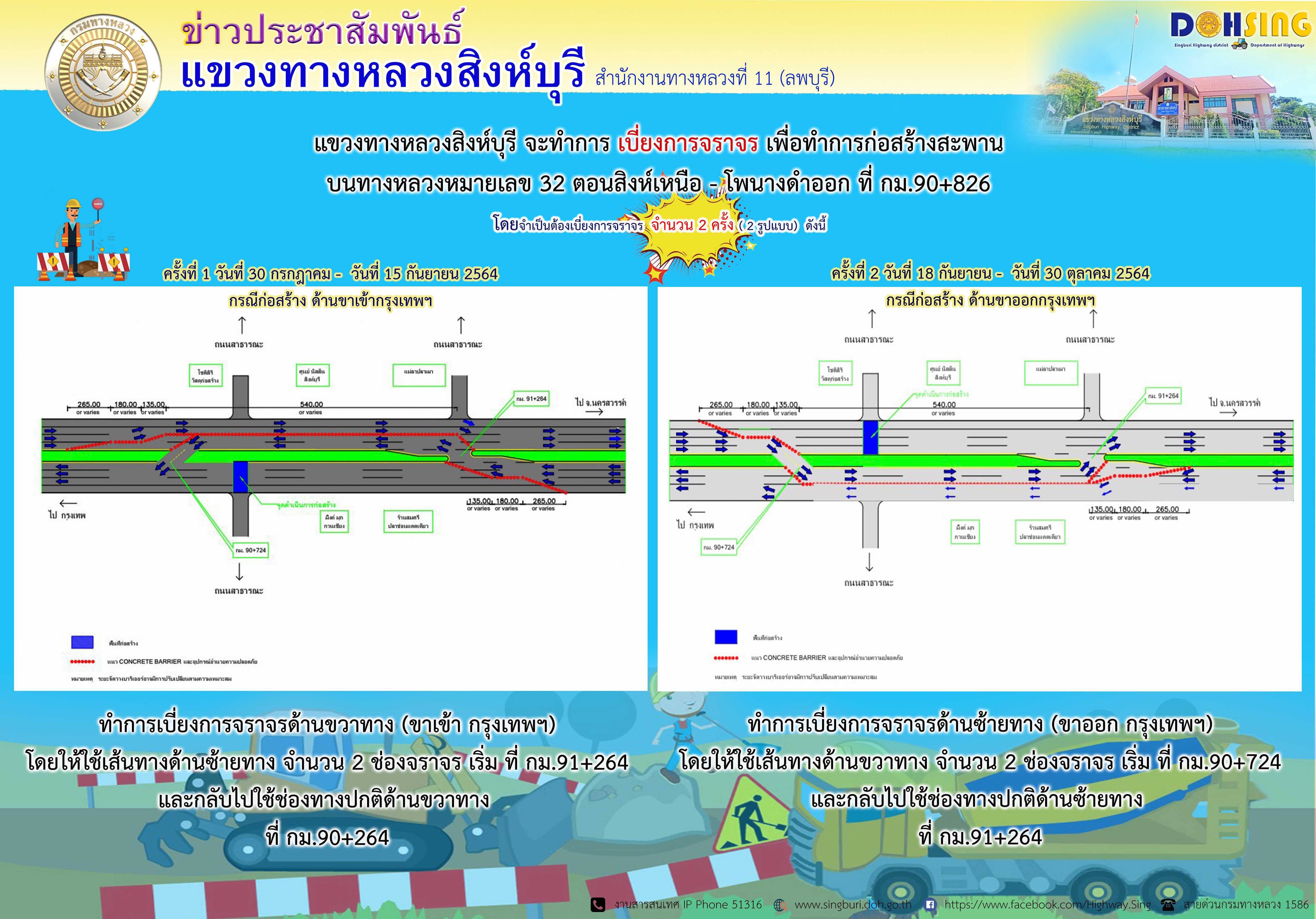 แขวงทางหลวงสิงห์บุรี จะทำการ #เบี่ยงการจราจร เพื่อทำการก่อสร้างสะพาน บนทางหลวงหมายเลข 32 ตอนสิงห์เหนือ - โพนางดำออก