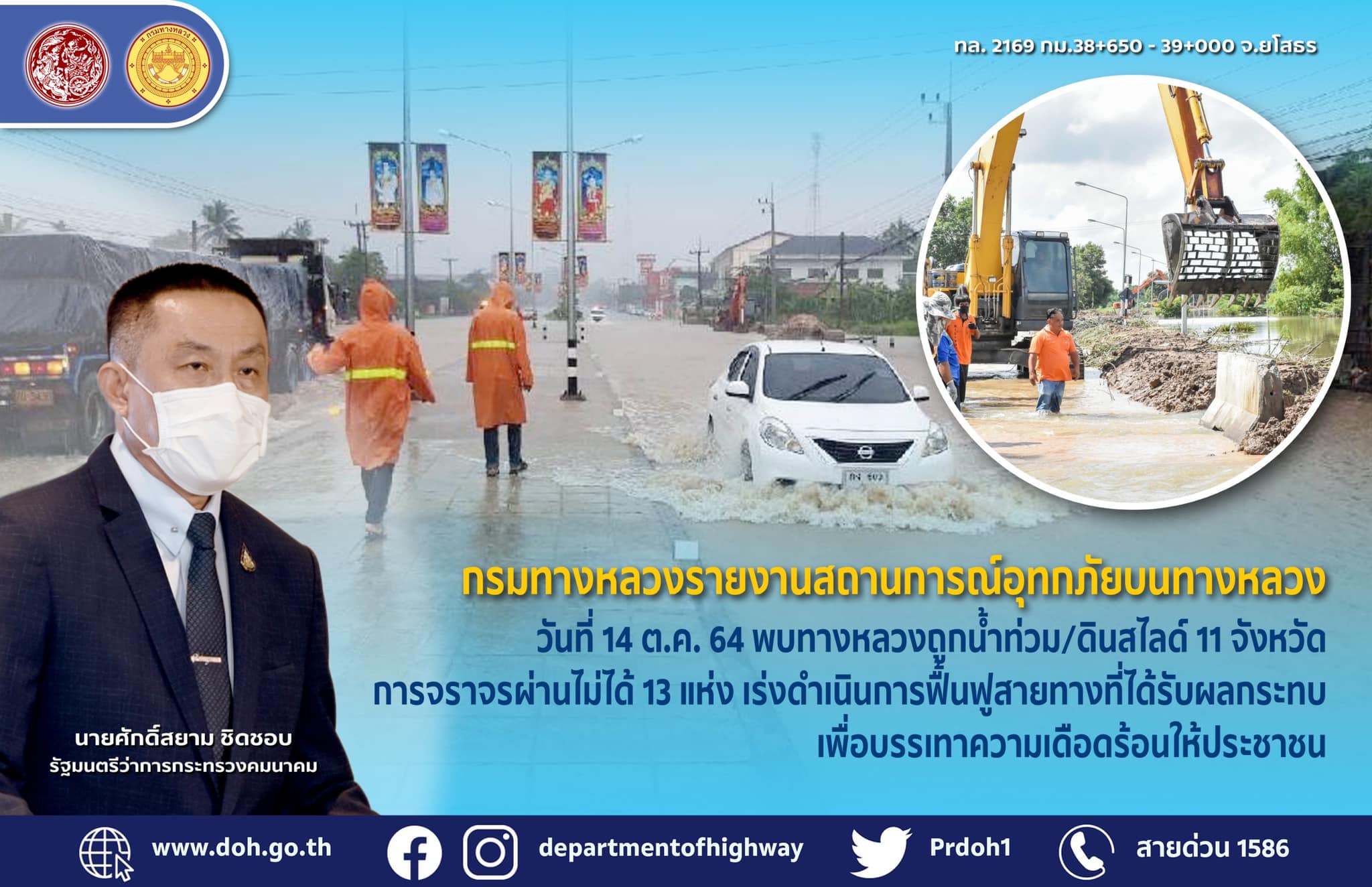 สำหรับสถานการณ์ประจำวันที่ 14 ตุลาคม 2564 เวลา 13.30 น. พบทางหลวงถูกน้ำท่วม/ดินสไลด์ และสะพานชำรุด จำนวน 11 จังหวัด ( 26 สายทาง 46 แห่ง) โดยทางหลวงในจังหวัดที่ได้รับผลกระทบจากอุทกภัย ได้แก่ 1) จ.ขอนแก่น 2) จ.มหาสารคาม 3) จ.มุกดาหาร 4) จ.นนทบุรี 5) จ.อ่างทอง 6) จ.พระนครศรีอยุธยา 7) จ.สุพรรณบุรี จ.นครสวรรค์ 9) จ.จันทบุรี 10) จ.ปราจีนบุรี 11) จ.สระแก้ว ซึ่งมีการจราจรผ่านไม่ได้ 13 แห่ง ดังนี้
