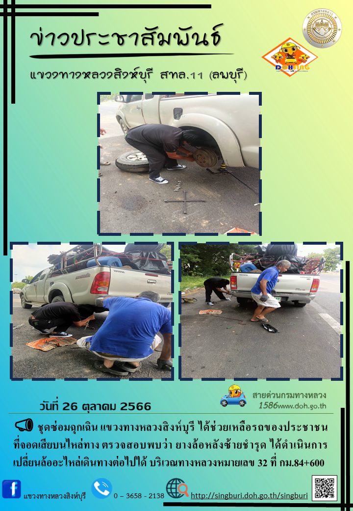 ประชาสัมพันธ์ วันที่ 27 ตุลาคม 2566 ชุดซ่อมฉุกเฉิน แขวงทางหลวงสิงห์บุรี ได้ช่วยเหลือรถประชาชนที่จอดเสียบนไหล่ทาง ตรวจสอบพบว่า ยางล้อหลังซ้ายชำรุด ได้ดำเนินการเปลี่ยนล้ออะไหล่ให้เดินทางต่อไปได้ เหตุเกิดบริเวณทางหลวงหมายเลข 32 กม.84+600