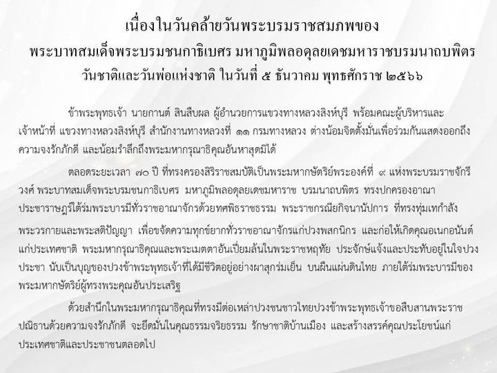 คำกล่าวน้อมรำลึกในพระมหากรุณาธิคุณ เนื่องในวันคล้ายวันพระบรมราชสมภพพระบาทสมเด็จพระบรมชนกาธิเบศร มหาภูมิพลอดุลยเดชมหาราช บรมนาถบพิตร วันชาติ และวันพ่อแห่งชาติ