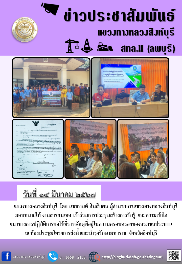 ประชาสัมพันธ์วันที่ 14 มีนาคม 2567แขวงทางหลวงสิงห์บุรี โดย นายกานต์ สินสืบผล ผู้อำนวยการแขวงทางหลวงสิงห์บุรี มอบหมายให้ งานสารสนเทศ เข้าร่วมประชุมสร้างการรับรู้และความเข้าใจ แนวทางการปฏิบัติการขอใช้ที่ราชพัสดุที่อยู่ในความครอบครองของกรมชลประทาน ณ ห้องประชุมโครงการส่งน้ำและบำรุงรักษามหาราช จังหวัดสิงห์บุรี