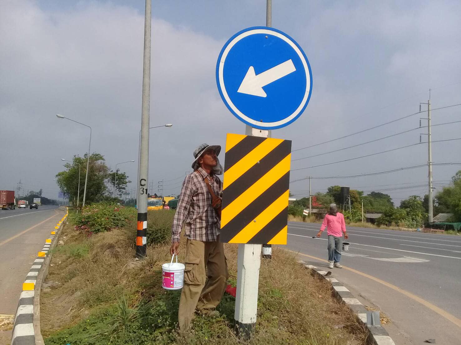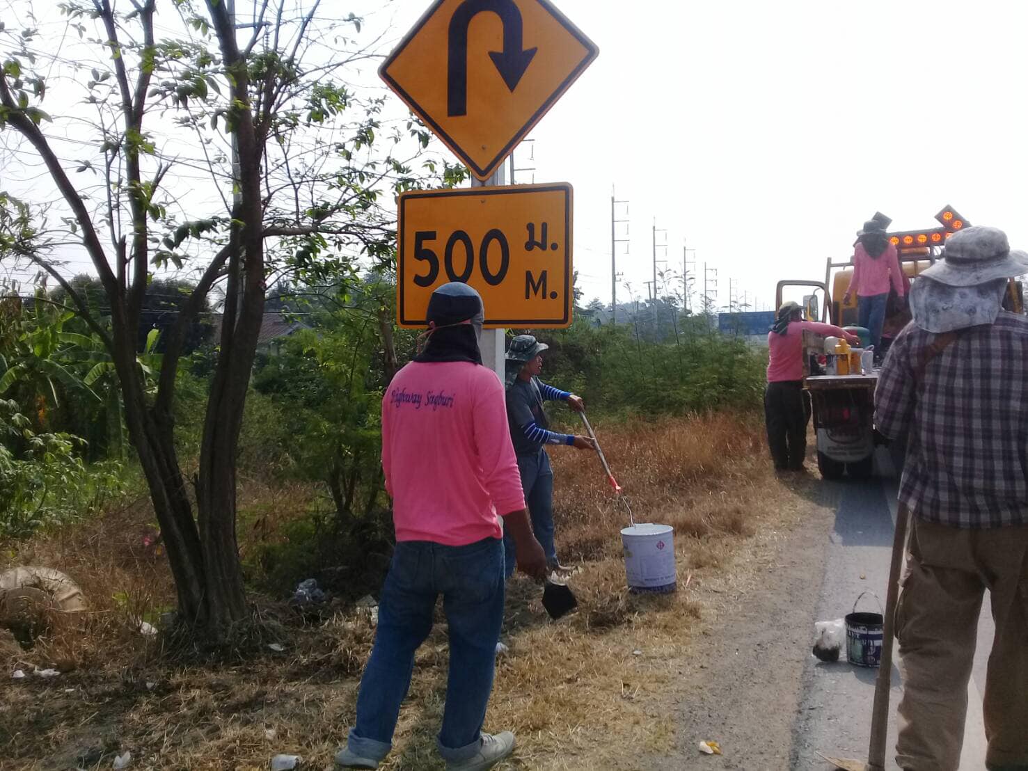 ดำเนินการทำความสะอาดและทาสีเสาป้ายจราจร บนทางหลวงหมายเลข 32
